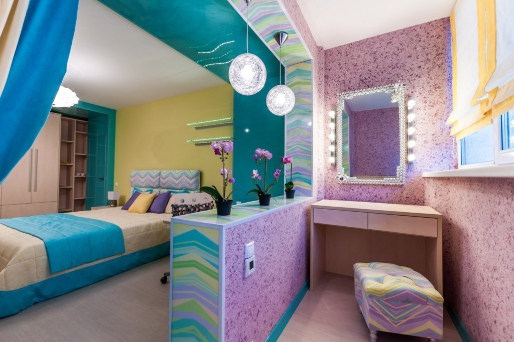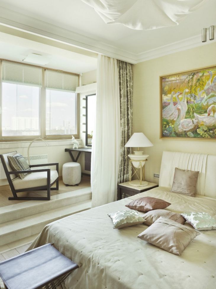 Peut-être l'une des options les plus courantes. Si votre chambre est petite et que vous voulez vraiment de l’espace, c’est une bonne idée d’attacher une loggia à la salle de relaxation. Très souvent, l'espace de la loggia est utilisé comme zone d'application du maquillage. Ou ils y ont mis un cintre et ont fait un petit dressing de fortune.