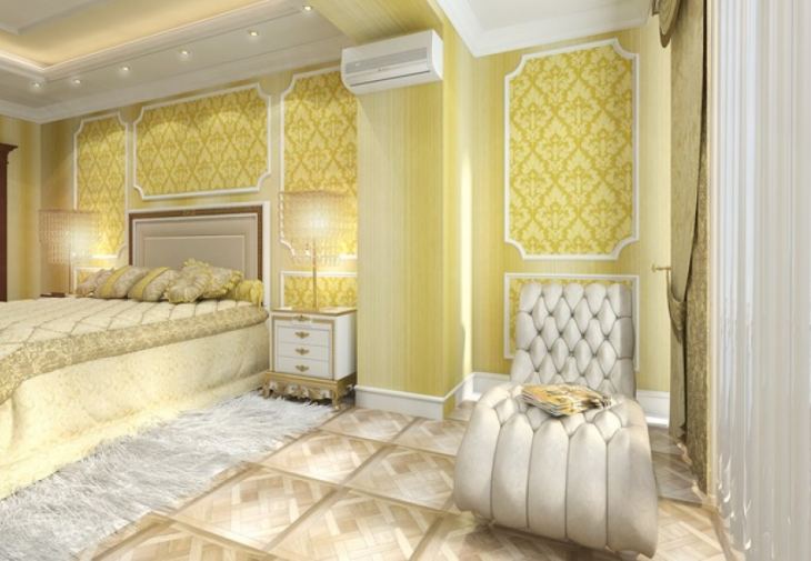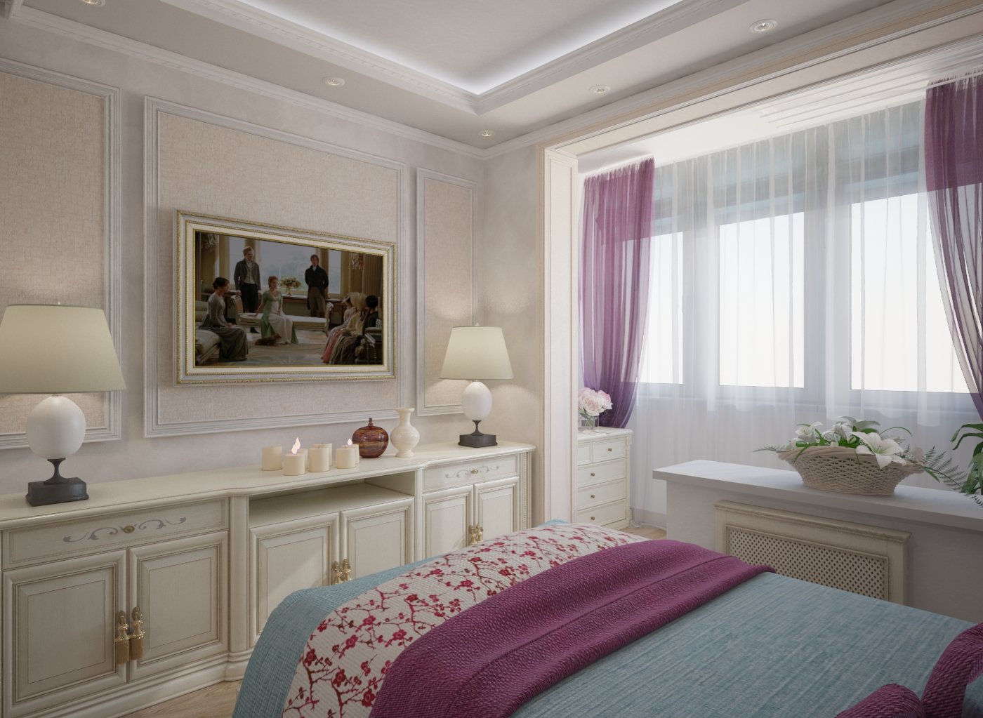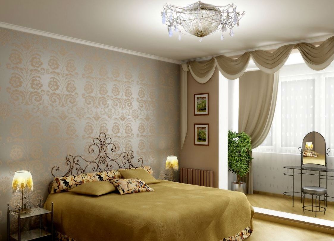 Le design de la chambre combiné avec une loggia dans un style classique