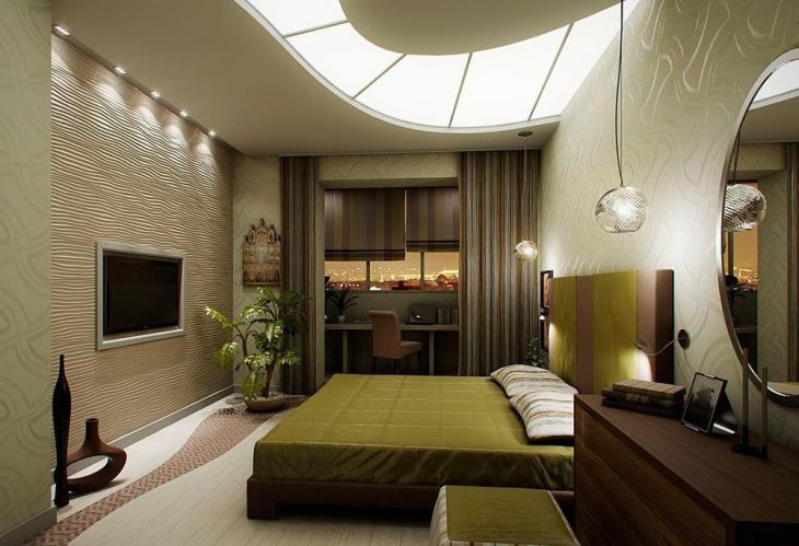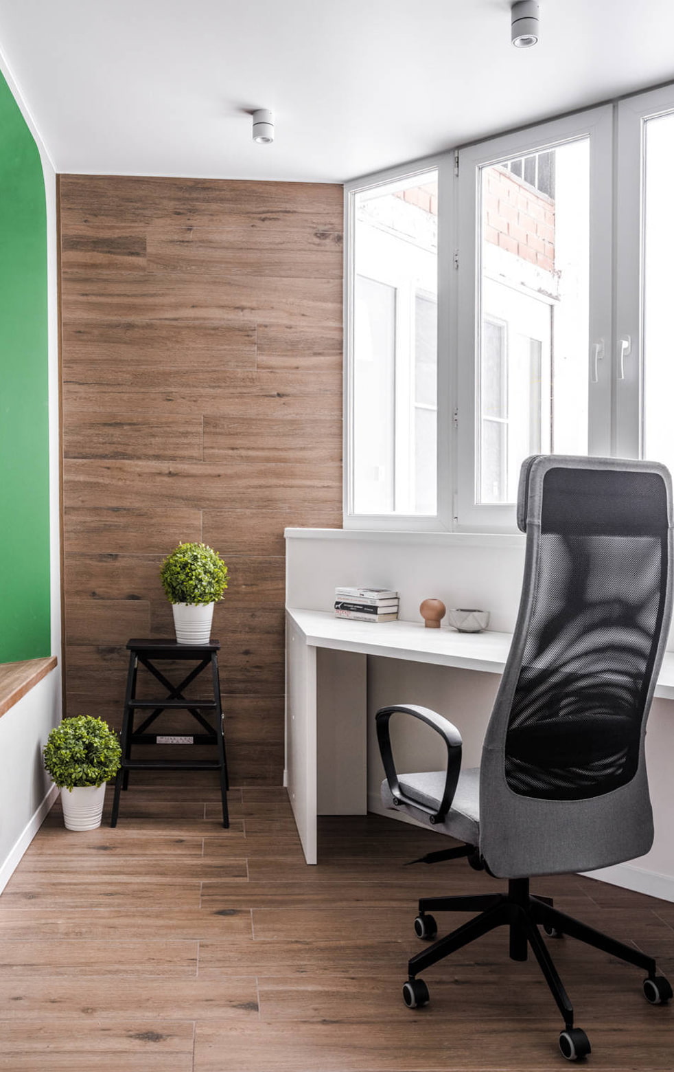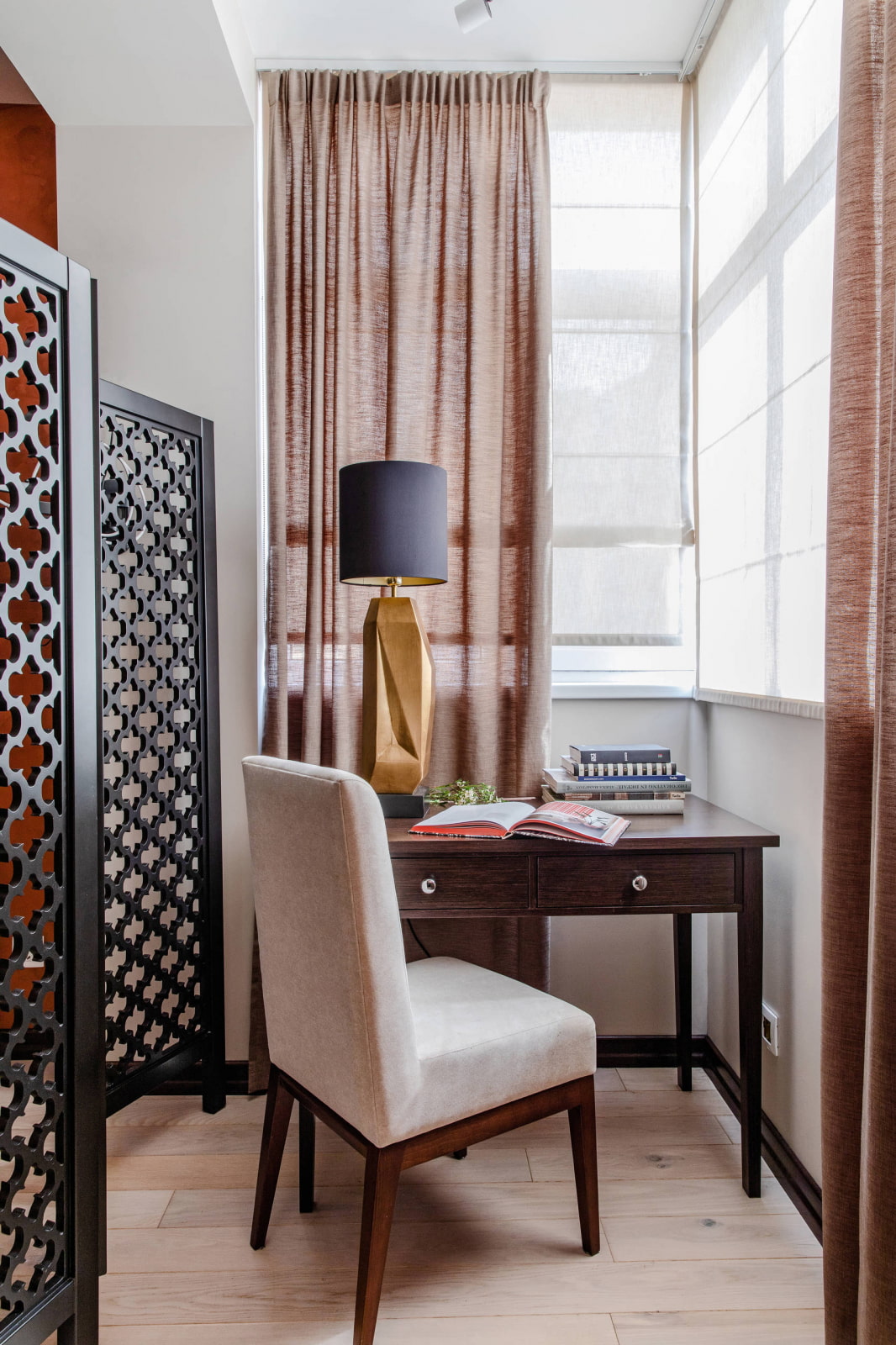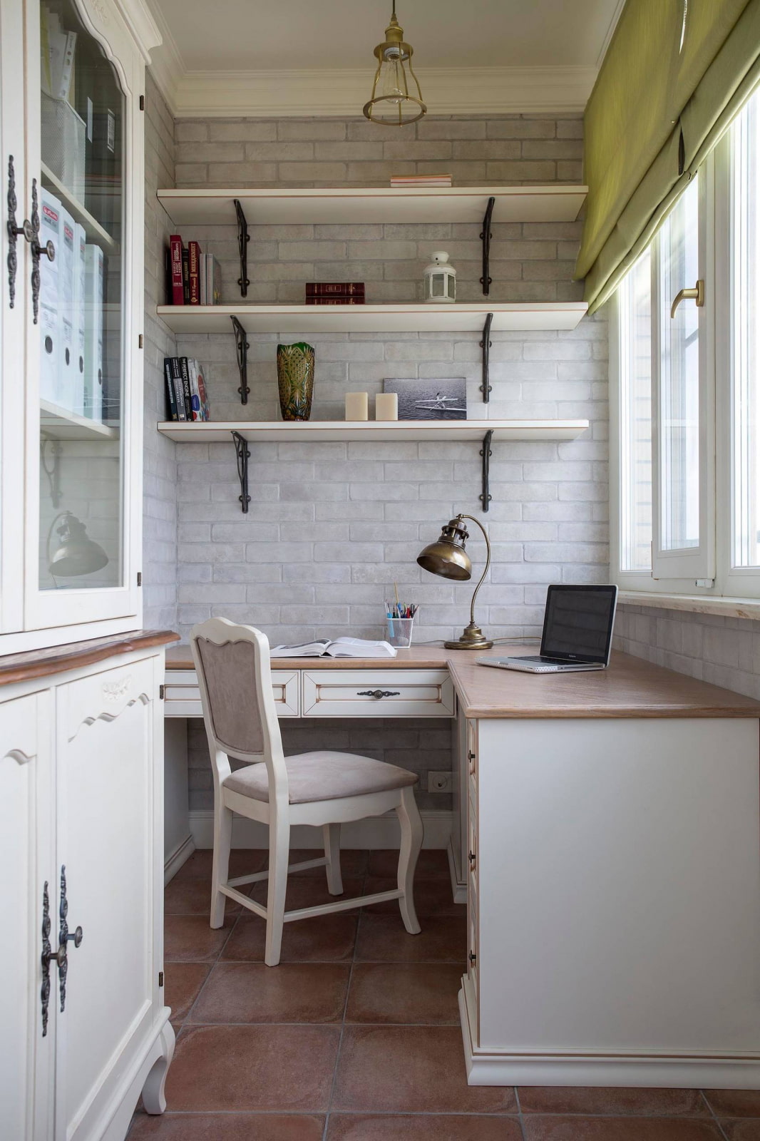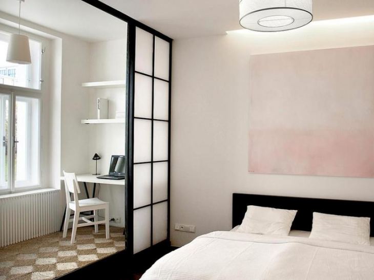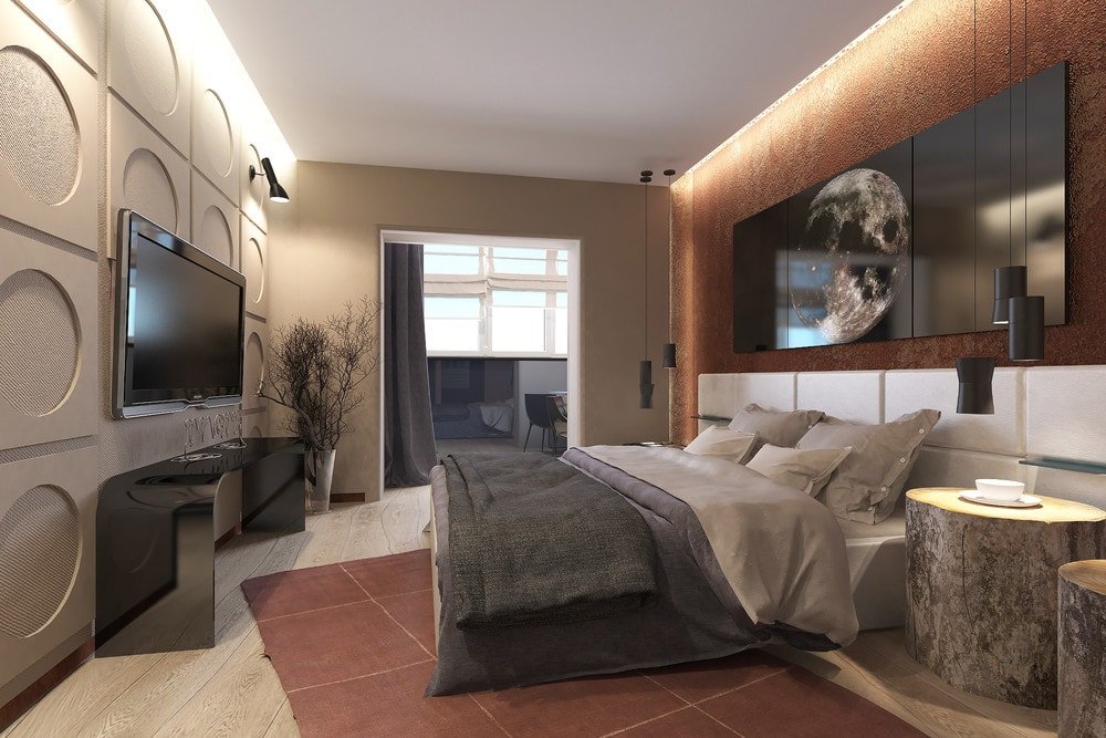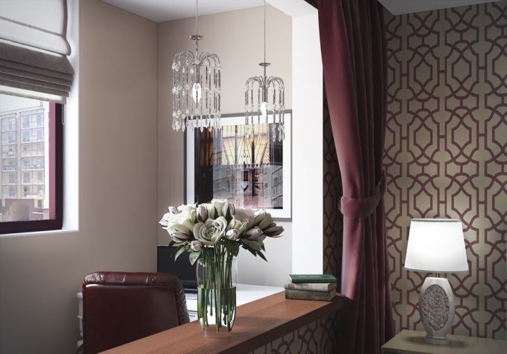 En revanche, si l'adhésion de la loggia se fait pour une sorte de zonage de l'espace, cela peut être souligné à l'aide de la décoration. Par exemple, une chambre et un bureau. Ce dernier est réalisé dans des couleurs plus sombres et plus saturées, les éléments de décor sont pratiquement absents. La concision contribue à une atmosphère de travail.