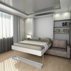 Un canapé ou un lit dans un studio peut non seulement servir de couchette. Il y a des lits qui se transforment rapidement en armoires. Ceci est réalisé grâce au mécanisme de serrage avec l'élément de levage du lit à la surface du mur. Les modèles sont disponibles en double, simple type. La première variété implique une élévation en hauteur, la seconde en largeur. Une caractéristique est la présence d'une armoire avec une taille plus grande qu'un lit. Il y a des armoires à portes battantes en vente. Dans ce cas, le lit se lève.
