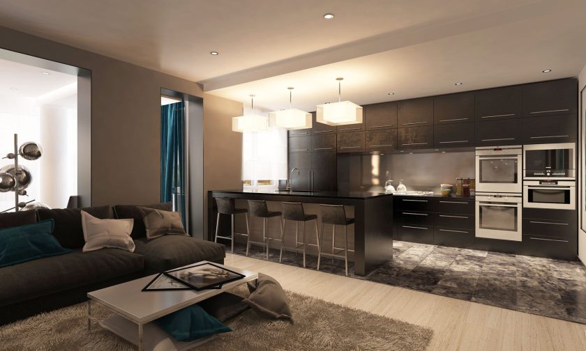 Le coin cuisine du salon est séparé comprenant un bar, une table ou même un canapé, qui peut être installé au centre de la pièce avec un dos à l'espace de travail pour cuisiner. Une grande armoire est placée dans un coin afin de ne pas créer un coin fermé et ne pas rétrécir visuellement l'espace.