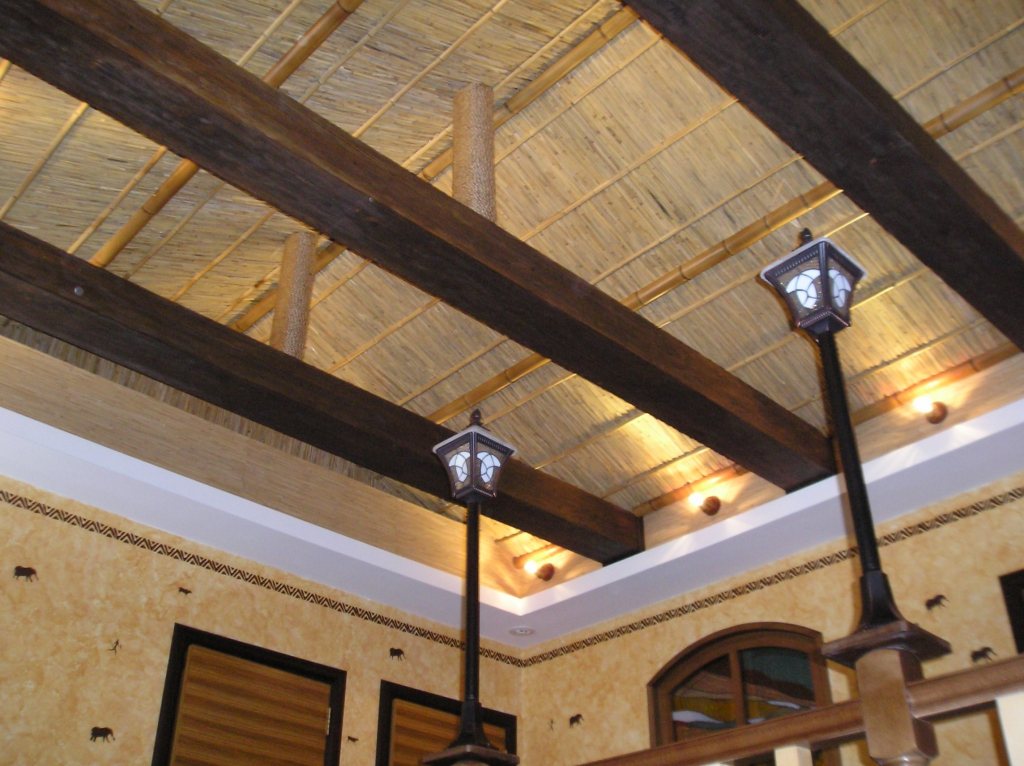 Si la pièce est conçue dans le style provençal, un chalet suisse, colonial, puis au sommet du plafond, blanchi en blanc ou en laiterie, la structure en bois des poutres doit être installée. L'arbre peut être d'une couleur naturelle ou à l'aide d'une teinture apportée à une nuance de chocolat noir.