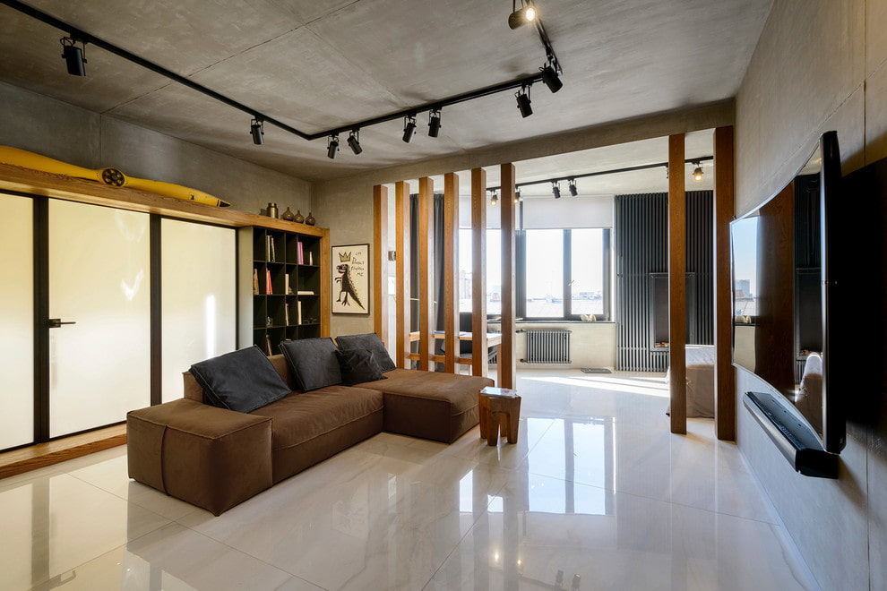 Dans le studio, il est conseillé d'utiliser un plafond pour zoner l'espace. Si vous faites, par exemple, une différence structurelle ou utilisez des matériaux différents entre la salle à manger et le salon, vous pouvez diviser visuellement la pièce en deux parties.