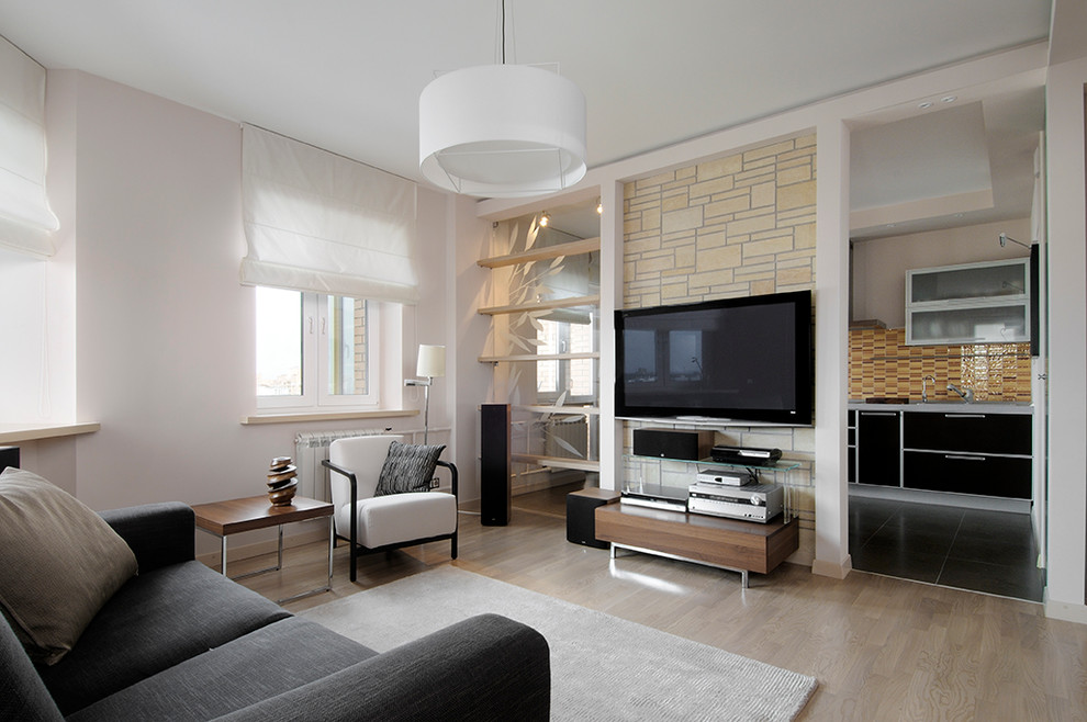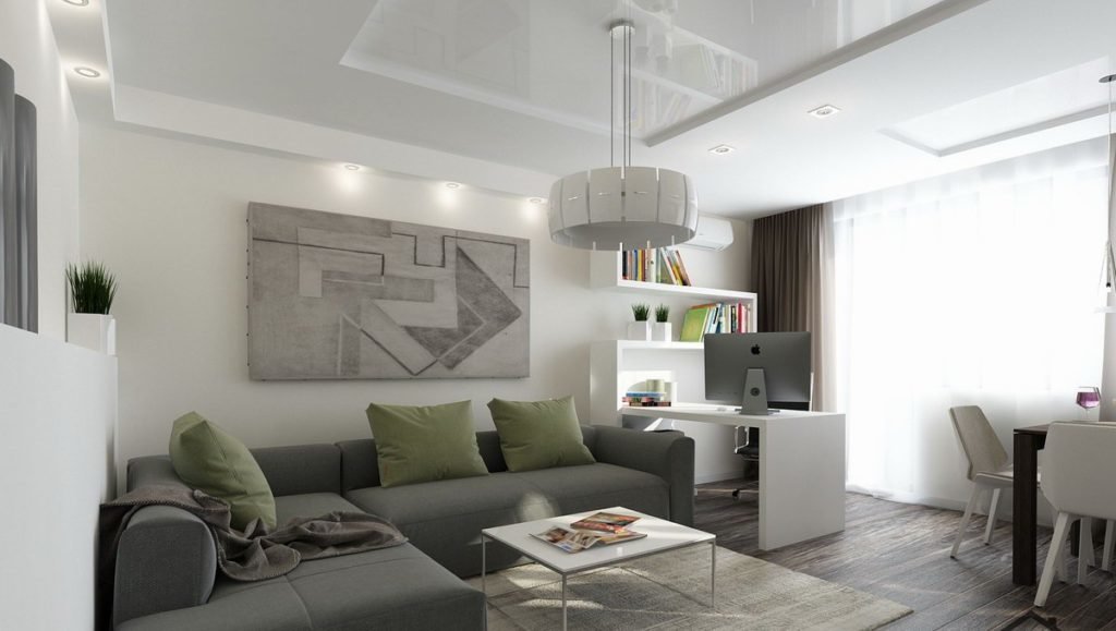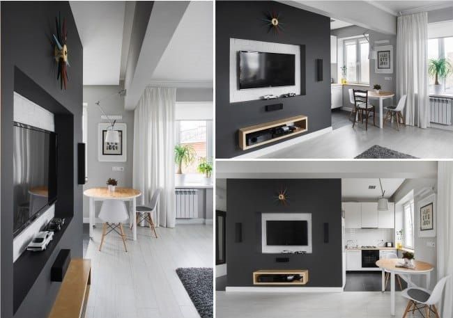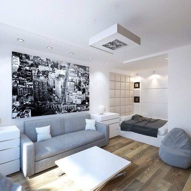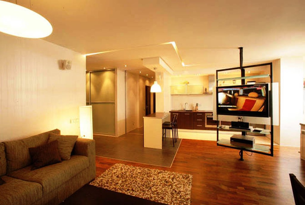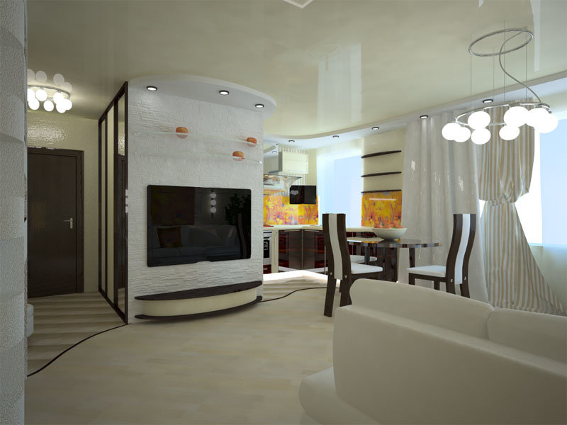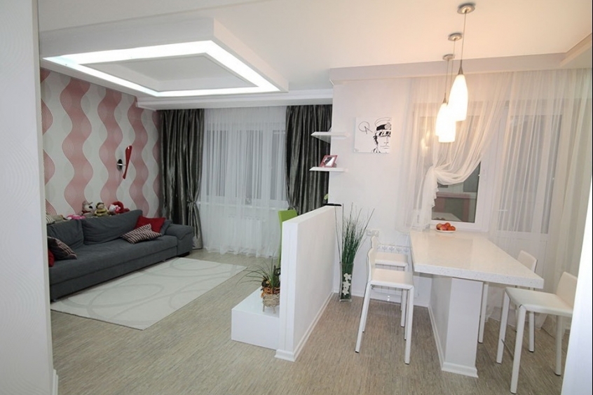 - Création d'un studio. Dans ce cas, vous ne pouvez démolir que le mur entre le salon et la cuisine, et vous pouvez également tout le reste (si cela est autorisé). Ce réaménagement est juste dans l'esprit des dernières tendances, et l'appartement se révélera non seulement spacieux, mais aussi moderne.