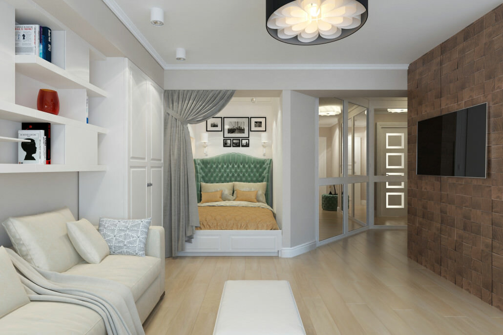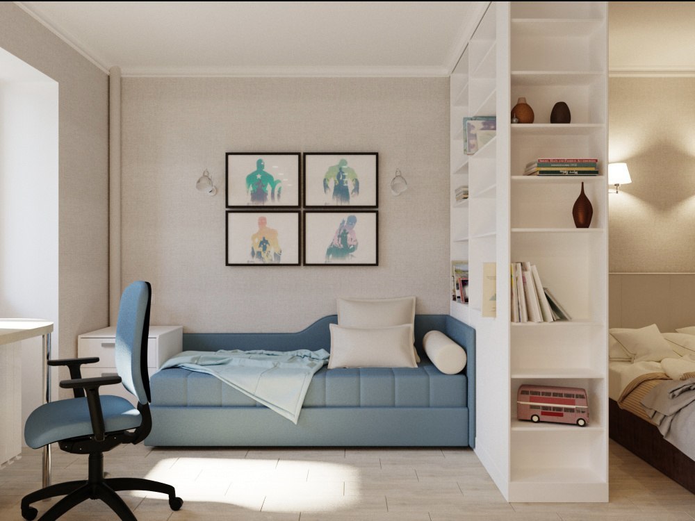 - Cinquième chambre. Une option atypique, cependant, si nécessaire, pour avoir une autre pièce, il est tout à fait possible de séparer une partie du salon. Ou, pour les appartements d'angle avec une fenêtre supplémentaire, la séparation peut être effectuée en fonction de celle-ci. Les pièces résultantes seront très petites, mais cette option est acceptable pour la séparation de la pépinière. Cela peut être fait en utilisant une cloison basse ou une paroi solide de cloison sèche.