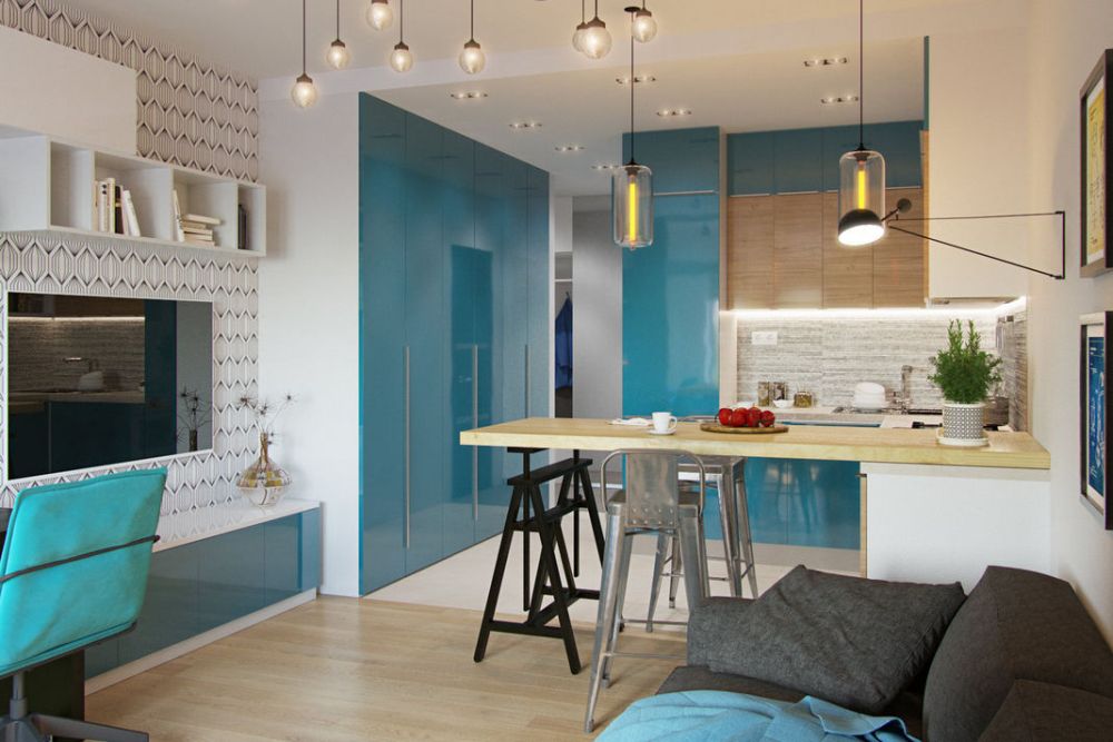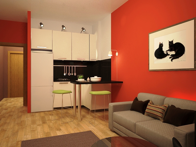 - Couleur, texture du sol. L'utilisation de divers matériaux et de petits seuils pour la séparation des zones s'intègre parfaitement à l'intérieur d'une petite pièce. Vous pouvez utiliser le podium pour placer le coin cuisine.