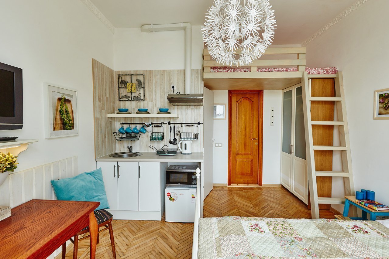 - Dans la mesure du possible, tous les appartements sont utilisés dans des studios. L'équipement des mezzanines, une commode sous le lit, l'allongement de la table de cuisine avec des couvercles sur le poêle et l'évier, combinant la loggia isolée et la pièce, en utilisant le rebord de la fenêtre comme bureau est la norme pour un petit studio.