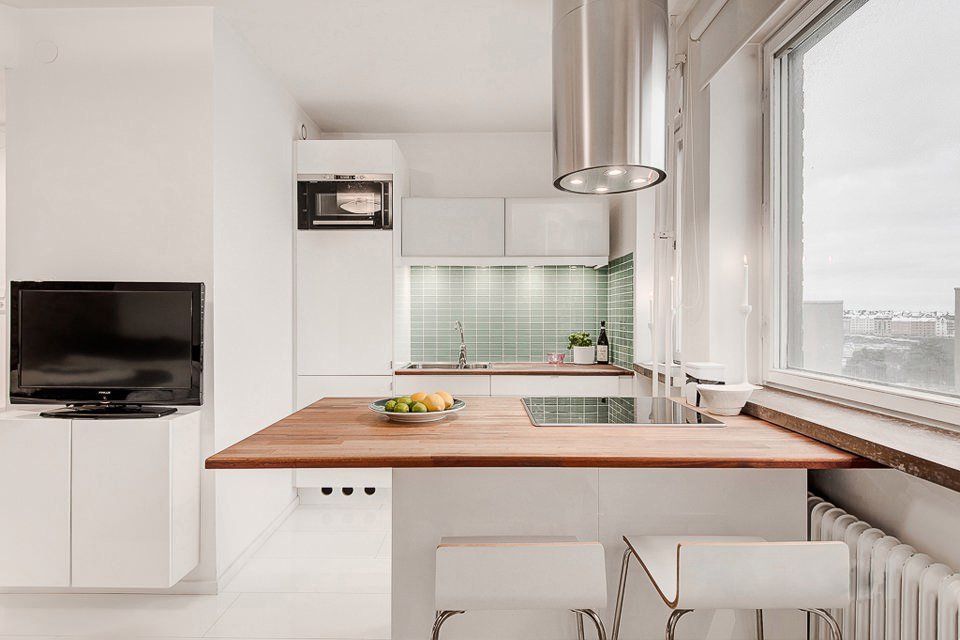 L'espace cuisine est séparé par un comptoir de bar, qui est une solution alternative à la table.
