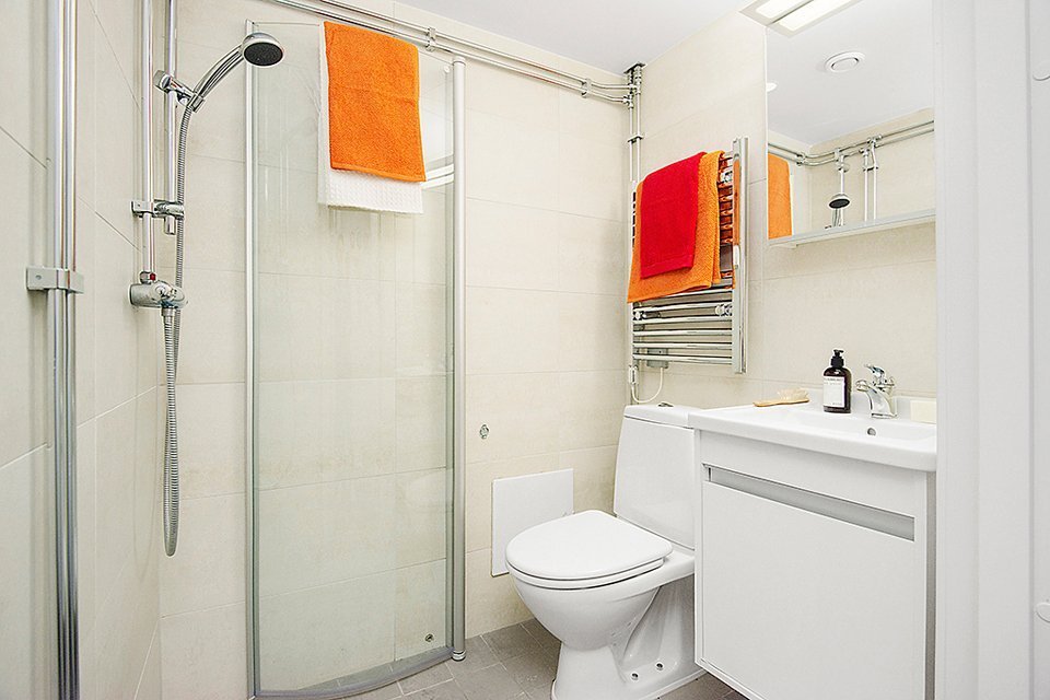 Dans les studios, la salle de bain et la salle de bain sont généralement combinées pour économiser de l'espace. Ils ont une douche ou une baignoire de type angulaire, des toilettes, une petite machine à laver. En présence d'un bain, l'évier est généralement jeté.