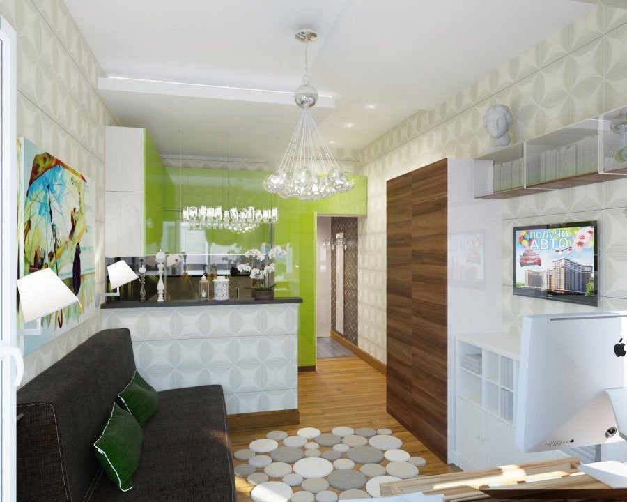 Le salon est rempli à souhait et opportunité. Une attention particulière doit être accordée à la garde-robe. Avec lui, vous pouvez séparer l'espace entre la chambre et le salon, il est également parfaitement remplacé par un cintre de studio avec une commode.