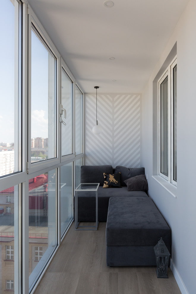 Décoration intérieure minimale. L'espace et la simplicité dominent ce style. Une option idéale est un canapé sur le balcon. Il ne prendra pas beaucoup de place et servira de merveilleux coin de détente.