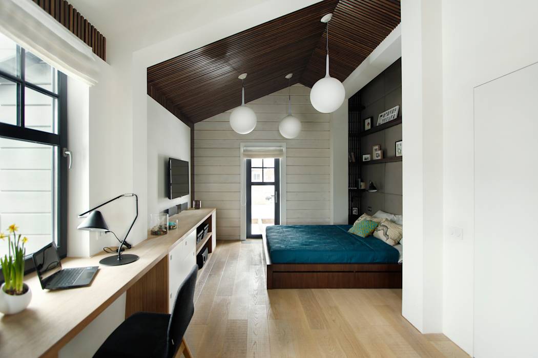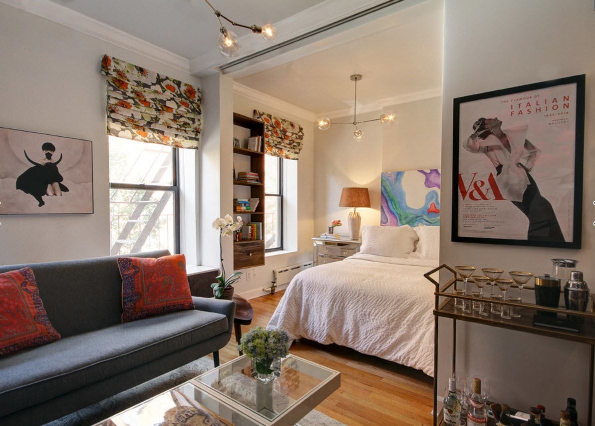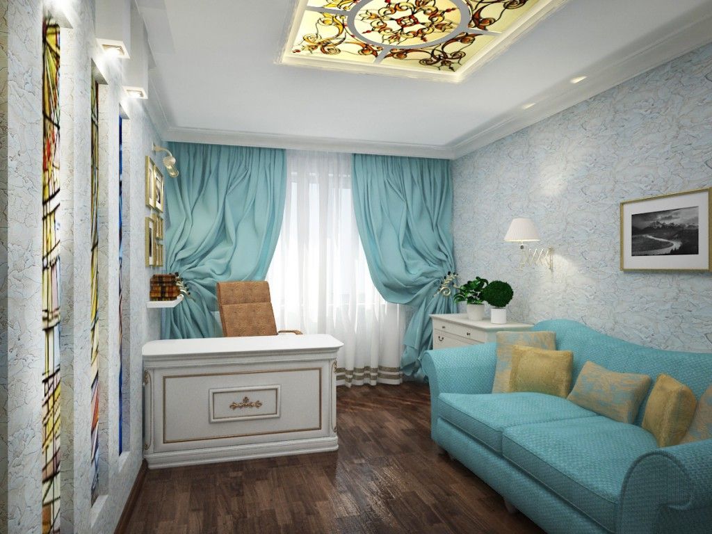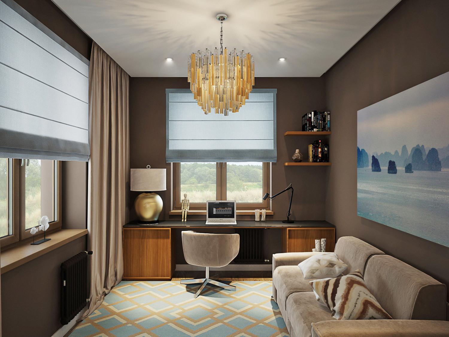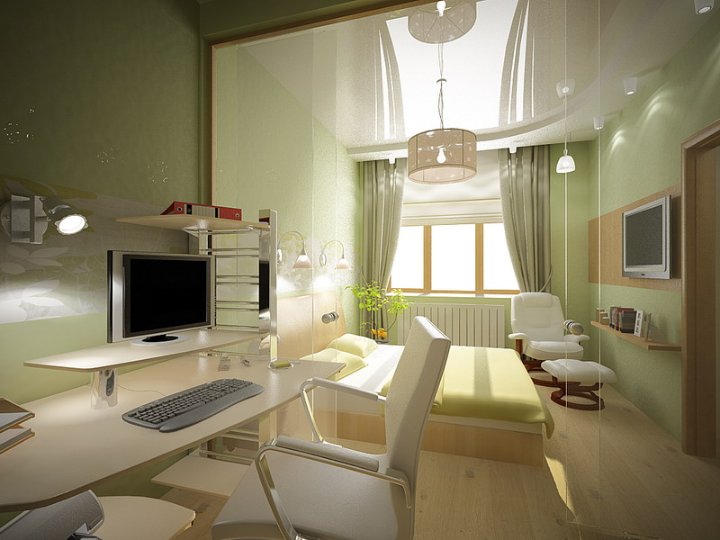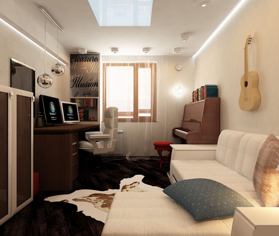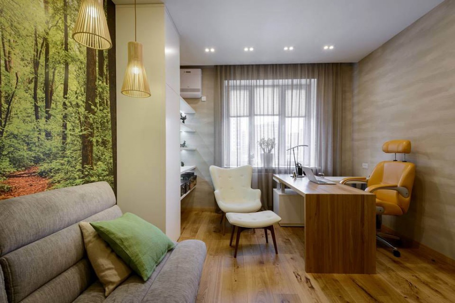 - Puisqu'il y a une chambre et un bureau dans une seule pièce, la superficie totale est divisée en deux zones avec des fonctionnalités différentes. Par conséquent, il est préférable d'abandonner l'éclairage aérien.