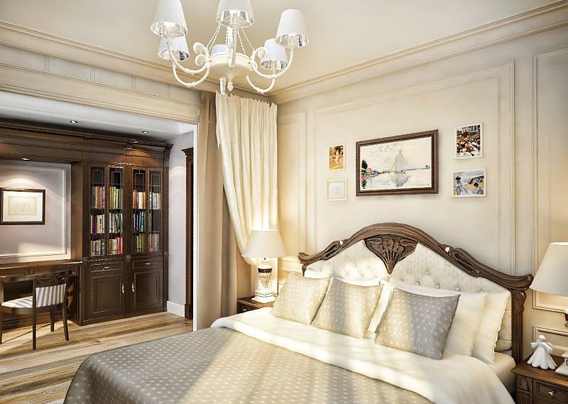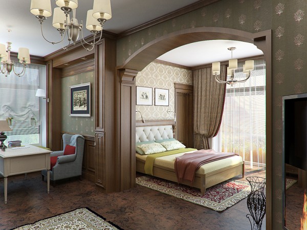 En combinant une chambre et un bureau dans un style classique, le design utilise des arches en stuc et des monogrammes luxueux. Les tons beige clair et miel doivent prévaloir dans la pièce. Les matériaux de finition et le tissu des rideaux et des lits doivent être coûteux et de haute qualité. Le style classique implique une certaine démonstration de richesse.