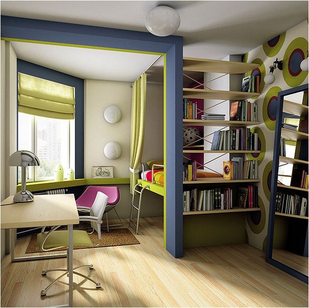 À l'intérieur de la chambre d'étude, la cloison sous la forme d'une étagère semble bonne, dans laquelle vous pouvez stocker des livres, des dossiers avec des documents et tout le reste nécessaire pour le travail