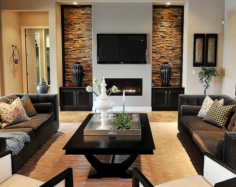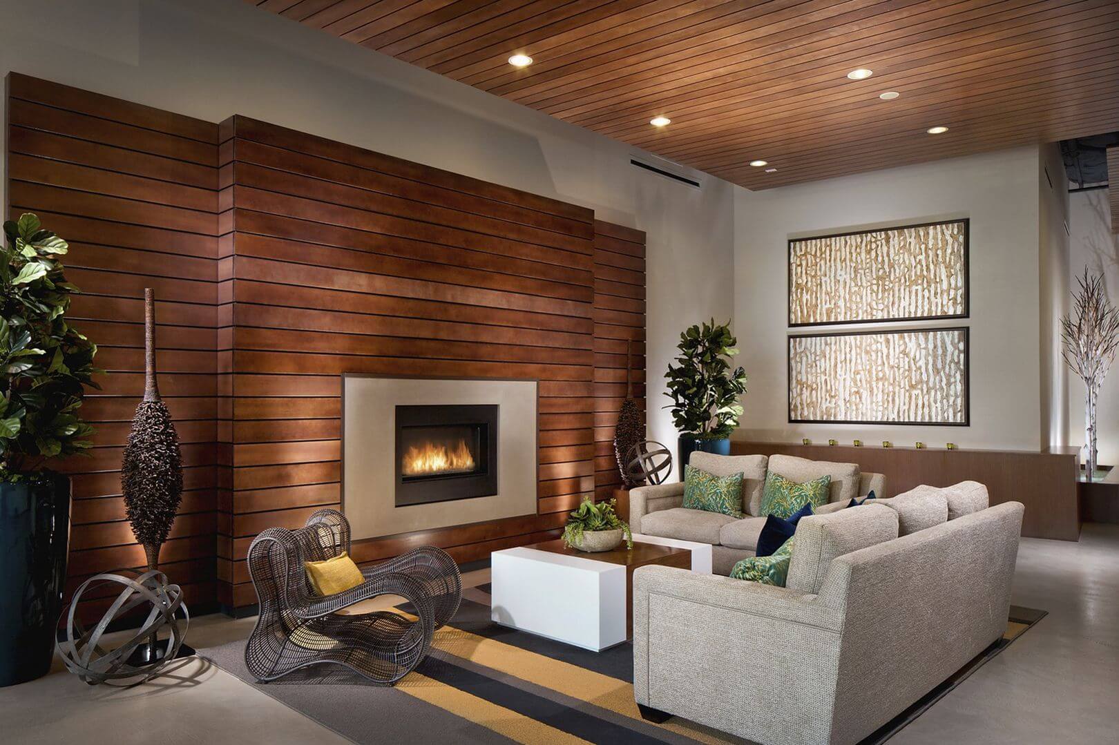- Parete con camino. Il camino può essere reale o simulato. Un posto vicino al camino è inconsciamente percepito come un "luogo caldo e sicuro", accanto al quale è bello mettere un divano o una sedia.
