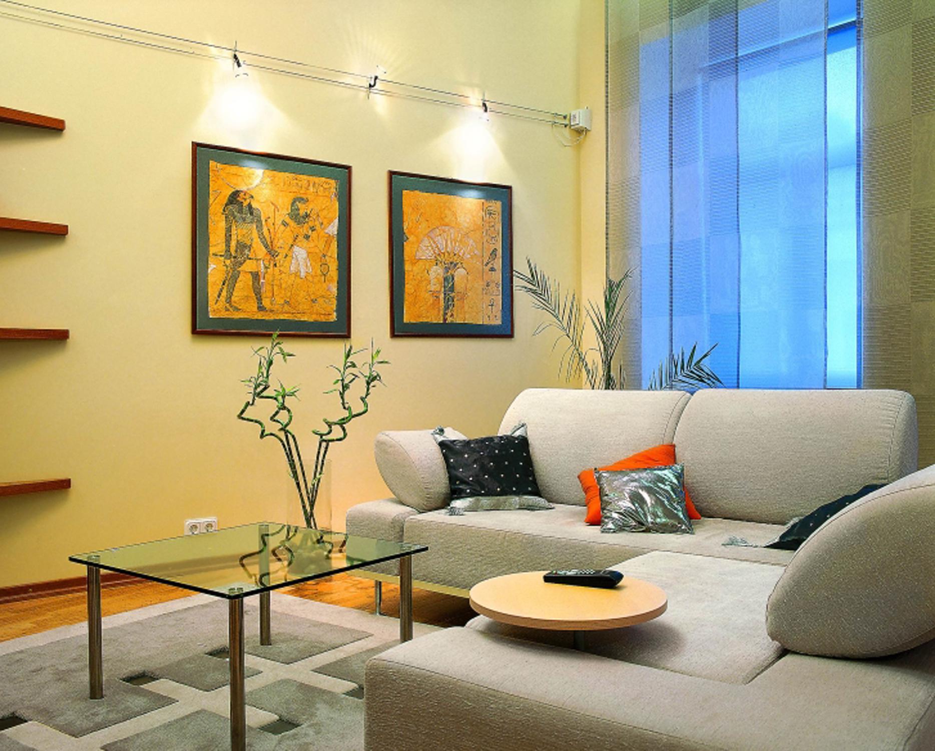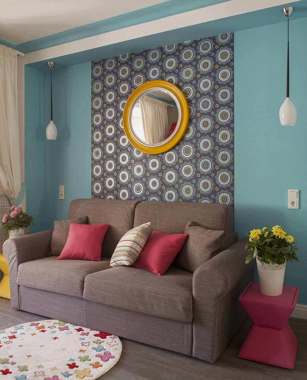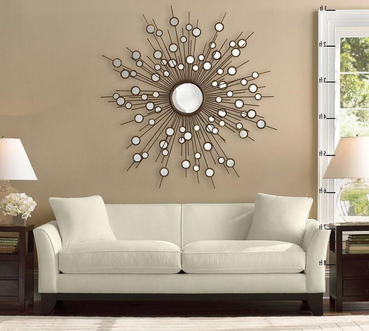 - Parete con un grande specchio o una foto in una bella cornice. Un grande specchio è un must per un piccolo soggiorno.