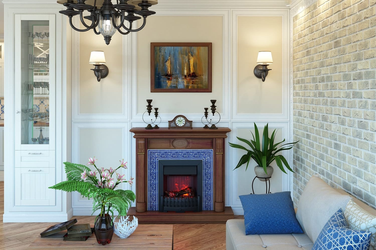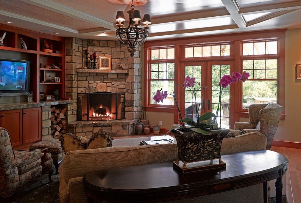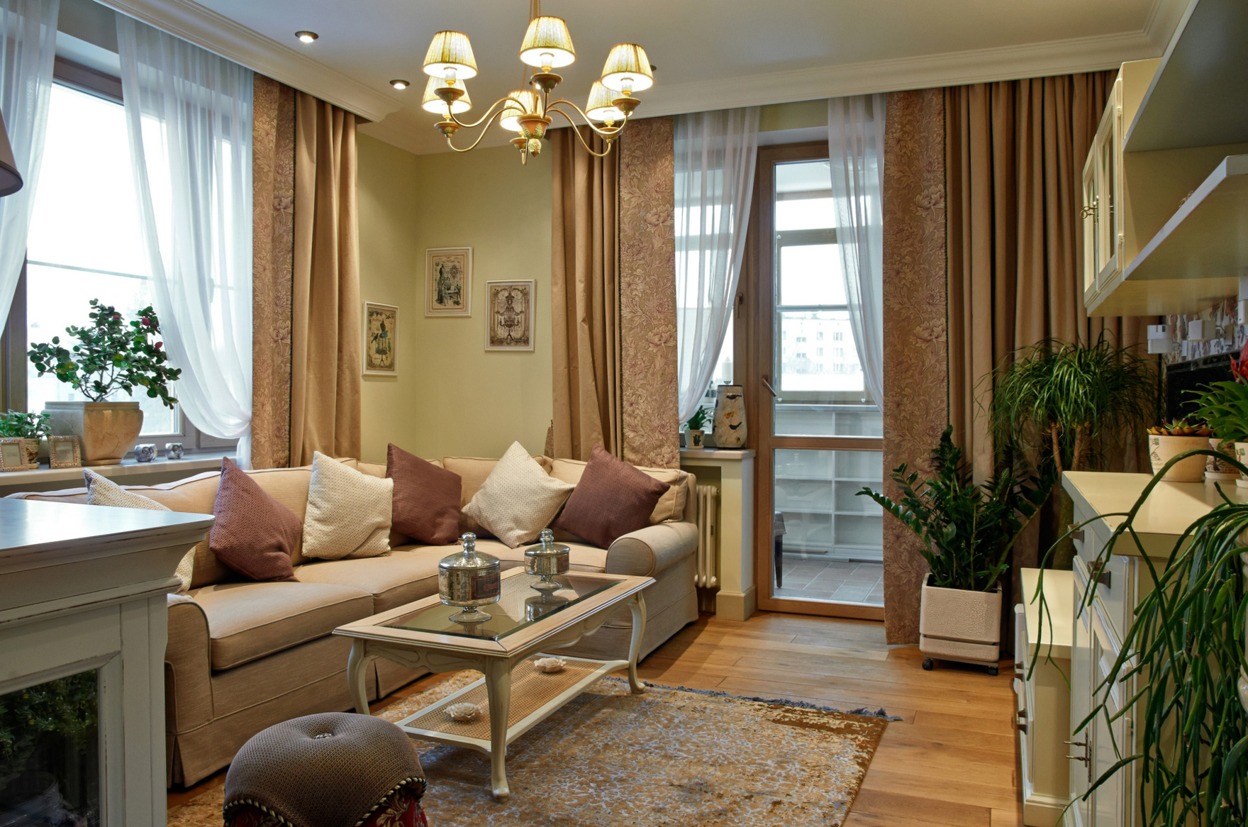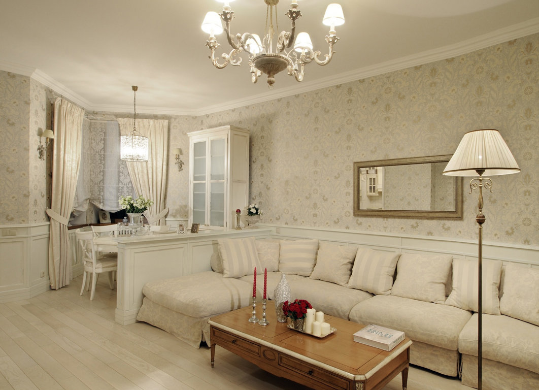- Classic. Può essere chiamato uno stile palazzo, senza lusso inutile. Il pavimento in un tale interno è realizzato posando piastrelle eleganti o lussuosi parquet. Il lampadario è di solito grande, cristallo, come in un palazzo. Avere un camino non è una decisione rara in uno stile classico. L'arredamento della stanza è pieno di maniglie dorate sul comò, grandi lampade da terra, mobili imbottiti con fodera in velluto.