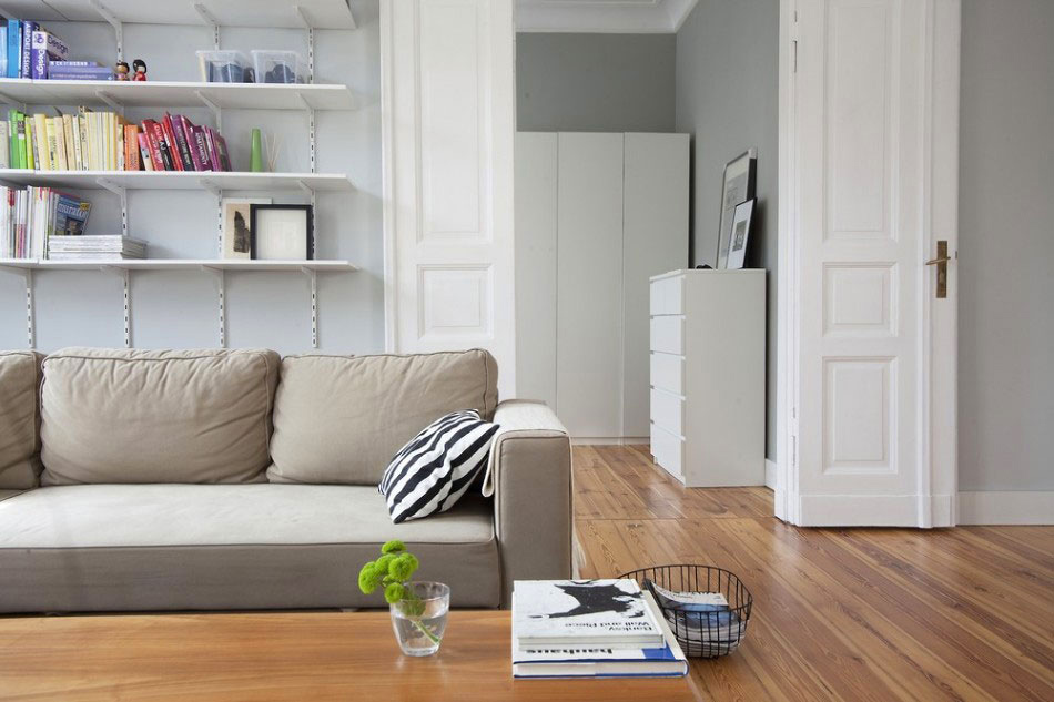 - Parzialmente, ogni zona è distinta da elementi degli interni o dei mobili stessi. Ad esempio, una libreria con libri riempirà la stanza di intimità, allo stesso tempo separerà l'area di lavoro dalla camera da letto. Non deve essere enorme in tutta la stanza, solo un po 'per determinare il confine. Dovrebbe apparire visivamente così: in un angolo, una camera da letto, per esempio, e nell'altro un soggiorno. Ma in generale, dovrebbe apparire armonioso e dovrebbe essere interconnesso da uno stile. Mobili non indipendenti.