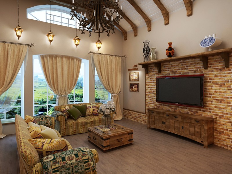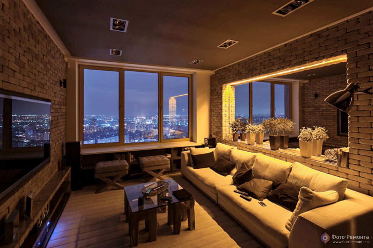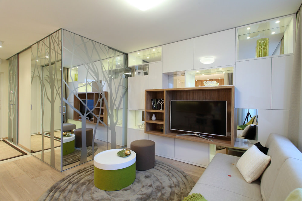 Se l'appartamento stesso ha altre stanze e l'area è abbastanza grande, allora separa un soggiorno per uscire con gli ospiti. La cosa più comune che i proprietari vogliono vedere è la presenza di un divano, due poltrone e un tavolino nel mezzo. Per indicare i confini, scegliere la larghezza desiderata del tappeto e posarlo. Per un look più moderno, in modo da non essere come tutti gli altri, aggiungono elementi insoliti all'interno. Ad esempio, evidenziare un muro con una TV. Intorno alla TV c'erano mattoni decorativi. Appendi grandi orologi e dipinti eleganti. Il divano stesso non deve essere posizionato contro il muro, ma può essere posizionato al centro della stanza.