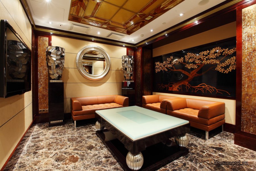 - Moderna. Considerato uno stile costoso. Suggerisce la presenza di una grande quantità di legno naturale. Linee morbide e curve su armadi e cassettiere. Mosaico e vetrate - una frequente decorazione degli interni. La stanza ricorda un antico museo, voglio esaminare ogni dettaglio.