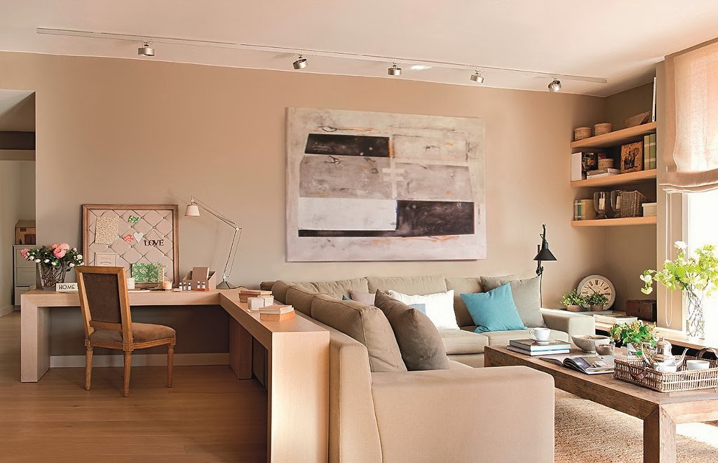 Questa opzione è adatta per coloro che hanno una stanza separata per il soggiorno. Chi trascorre molto tempo di lavoro a casa, ha bisogno della presenza di un angolo così appartato. Qui non è necessario racchiudere fortemente le zone; puoi semplicemente separare la scrivania con l'aiuto di una libreria. Quando scegli i mobili, dovresti considerare quale lato ha la priorità più vicina. Se ti fermi all'ormeggio, puoi aggiungere cordoli ai bordi e posizionare le lampade da terra nelle vicinanze. Se il posto di lavoro è più prioritario, vale la pena scegliere i pensili sopra il tavolo per documenti e lampade necessariamente luminose.