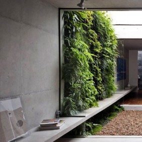 La composizione verde sul muro è composta da speciali dispositivi e strutture verticali. Scarica completamente le superfici orizzontali e spesso diventa l'incarnazione di un'interessante idea progettuale. Spesso formavano piante fitoncide che hanno un effetto curativo sul corpo.