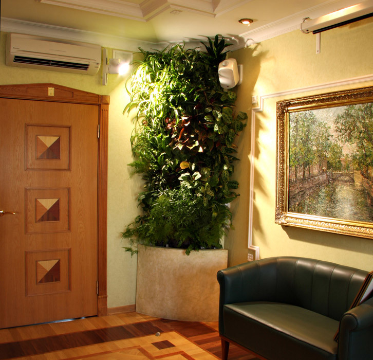 La composizione verde sul muro è composta da speciali dispositivi e strutture verticali. Scarica completamente le superfici orizzontali e spesso diventa l'incarnazione di un'interessante idea progettuale. Spesso formavano piante fitoncide che hanno un effetto curativo sul corpo.