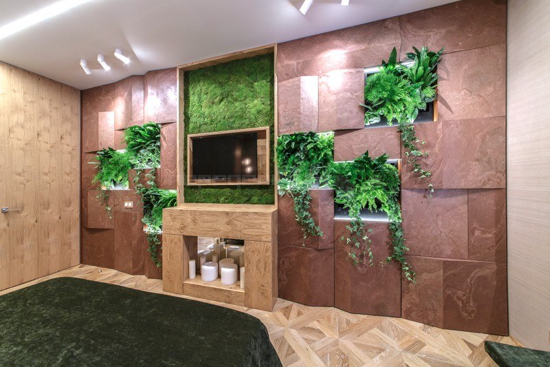 Fitostena nel soggiorno, realizzato in uno stile ecologico