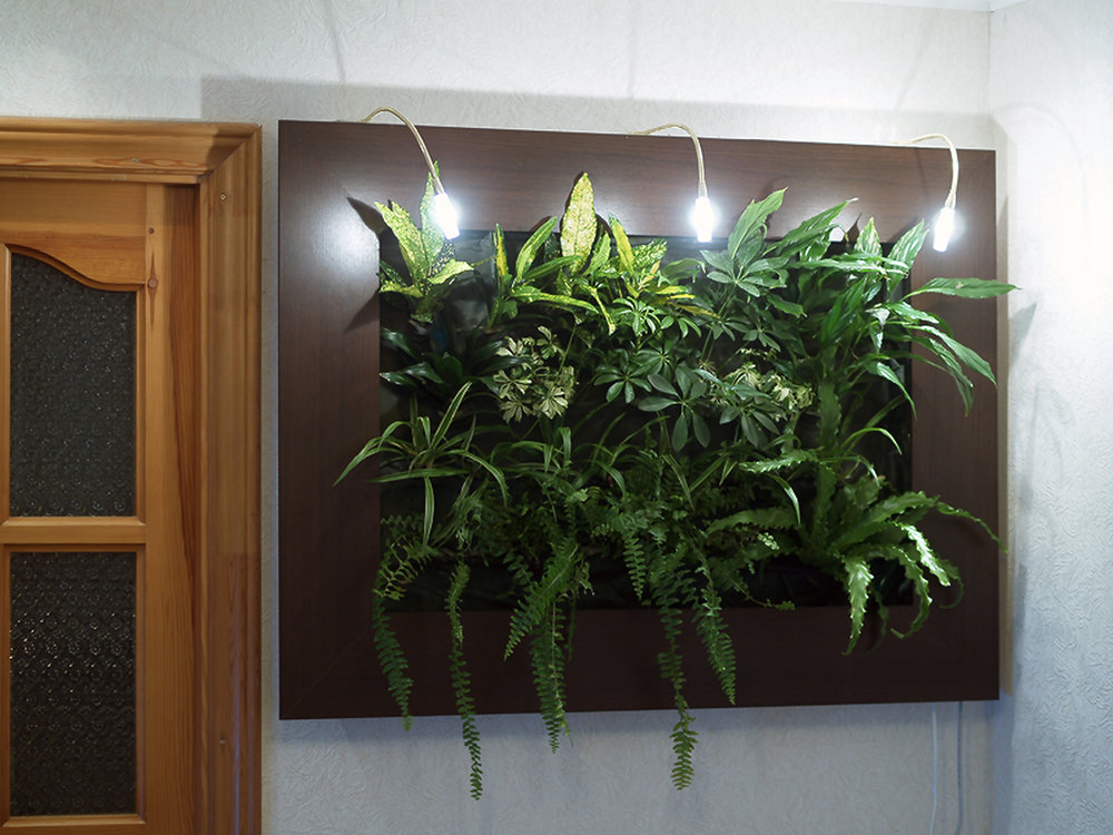 - Immagini fito e phytopanno. Presentato come un singolo modulo decorativo, prodotto in diverse dimensioni. Il design si basa su una cornice o rete (per riempire il terreno) e compensato.