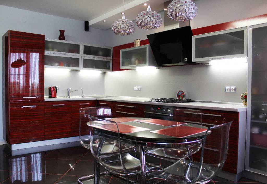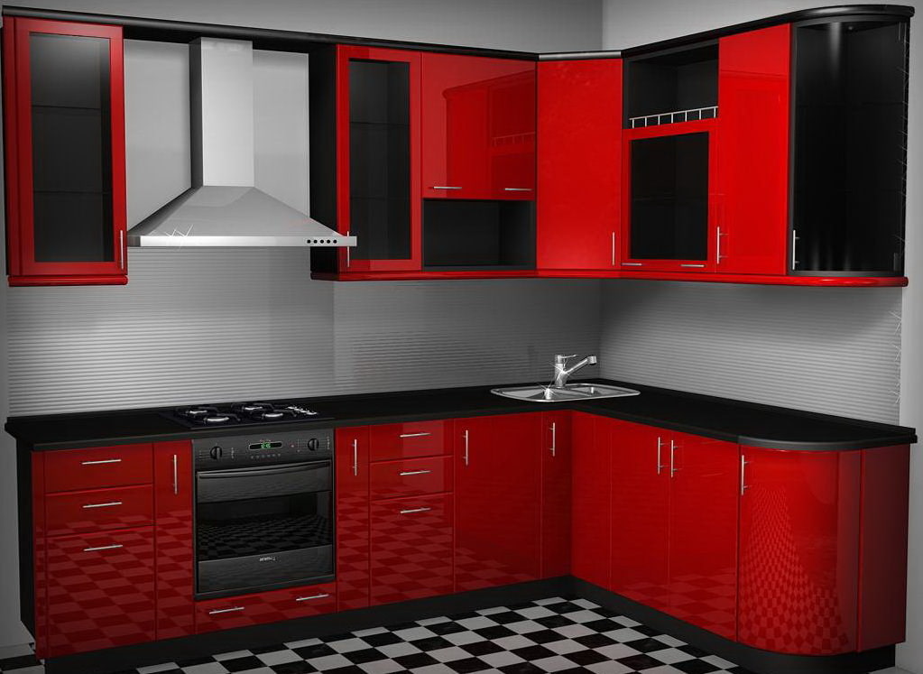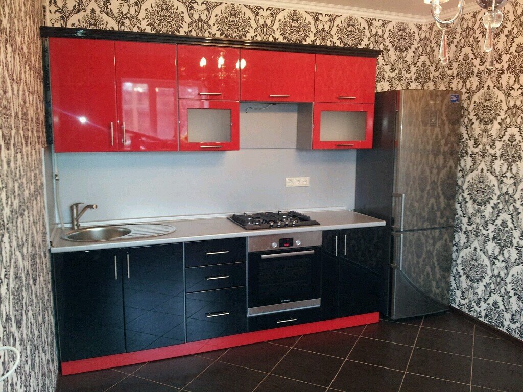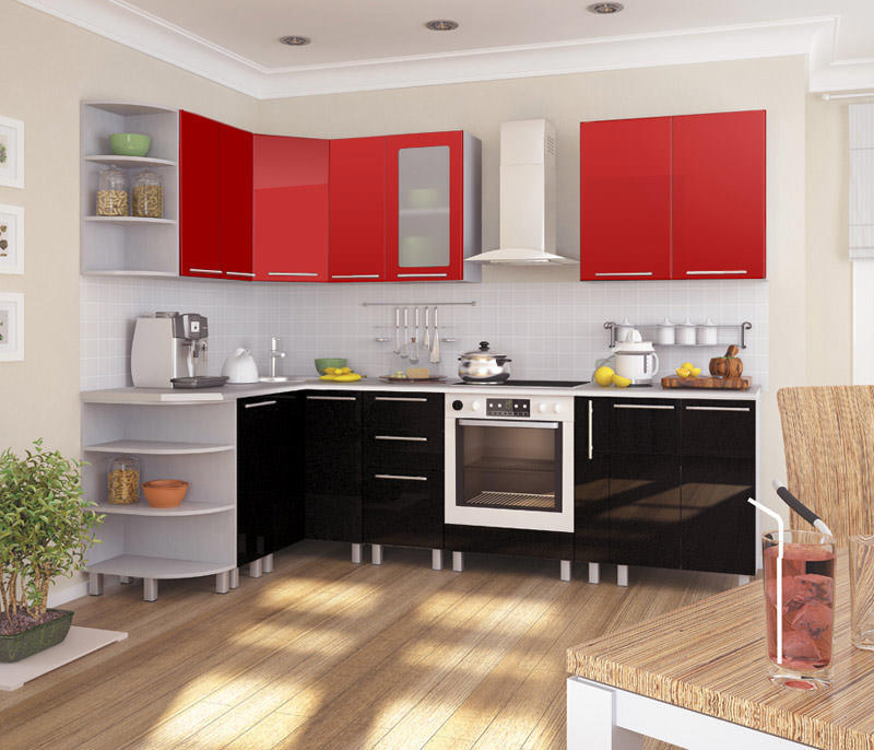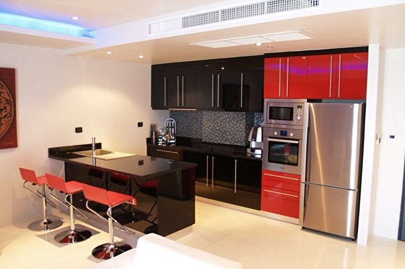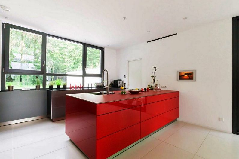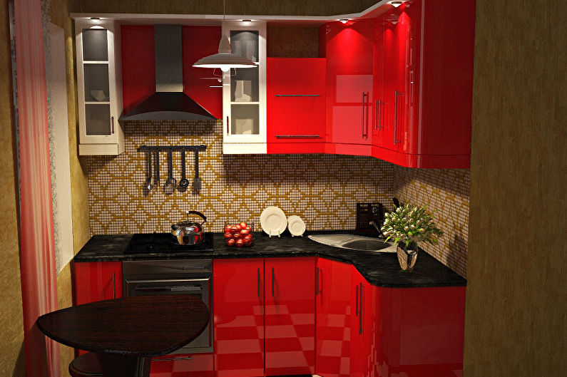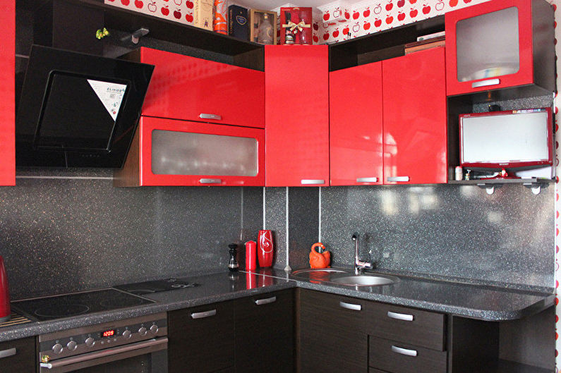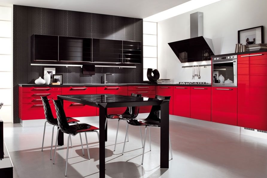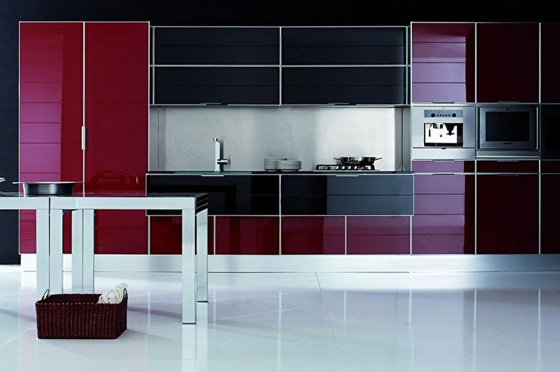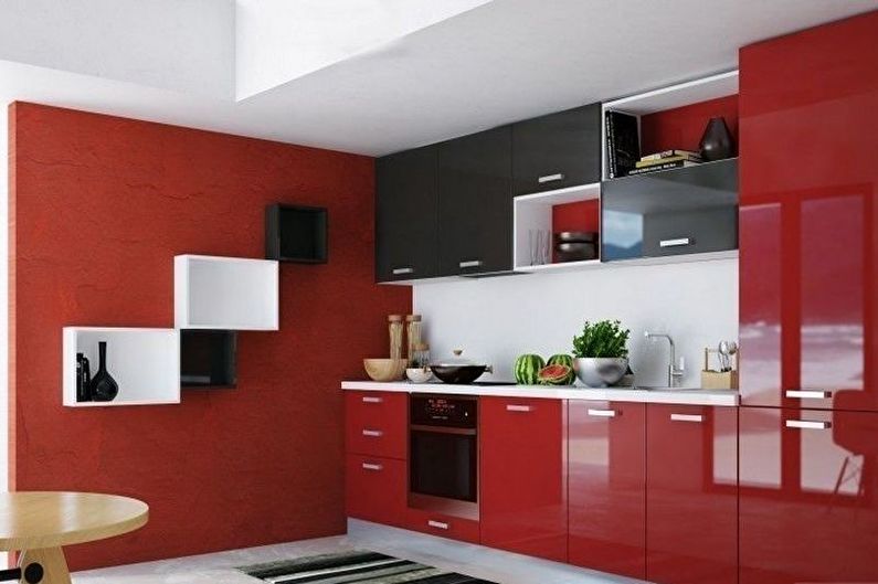 I mobili della cucina sono realizzati con vernice, smalto, vernici ad effetto metallico. I singoli elementi possono essere realizzati in vetro o metallo. Spesso usato da cucina rosso superiore nero inferiore, meno spesso - il posizionamento dei fiori sul principio di una scacchiera. Il nero può essere solo un dettaglio individuale che pacifica il tripudio del rosso, ad esempio i controsoffitti.