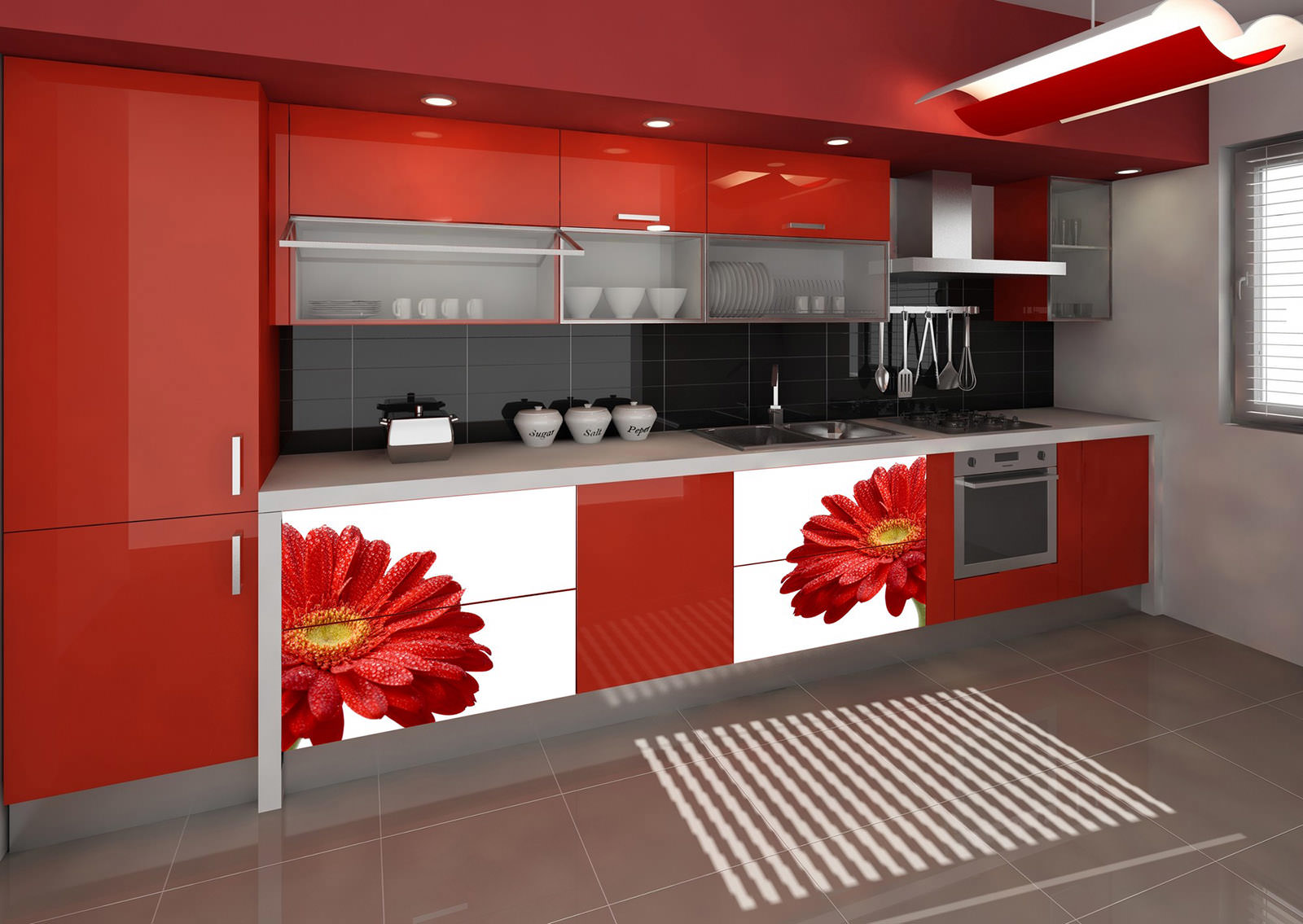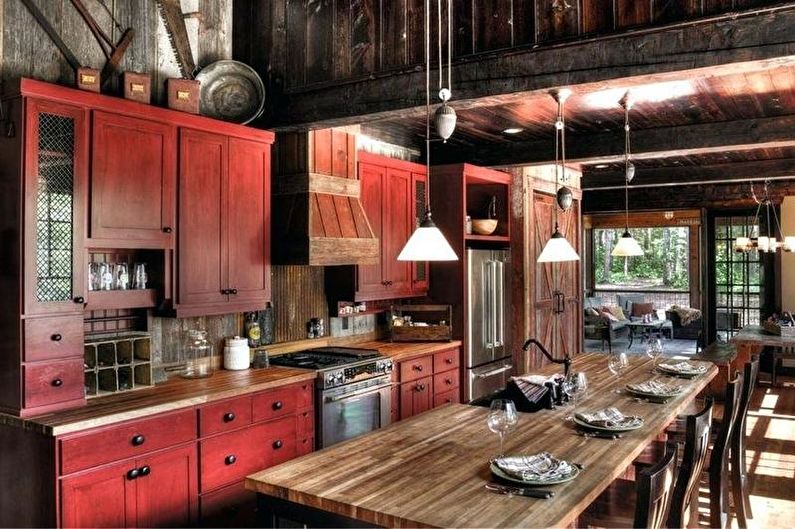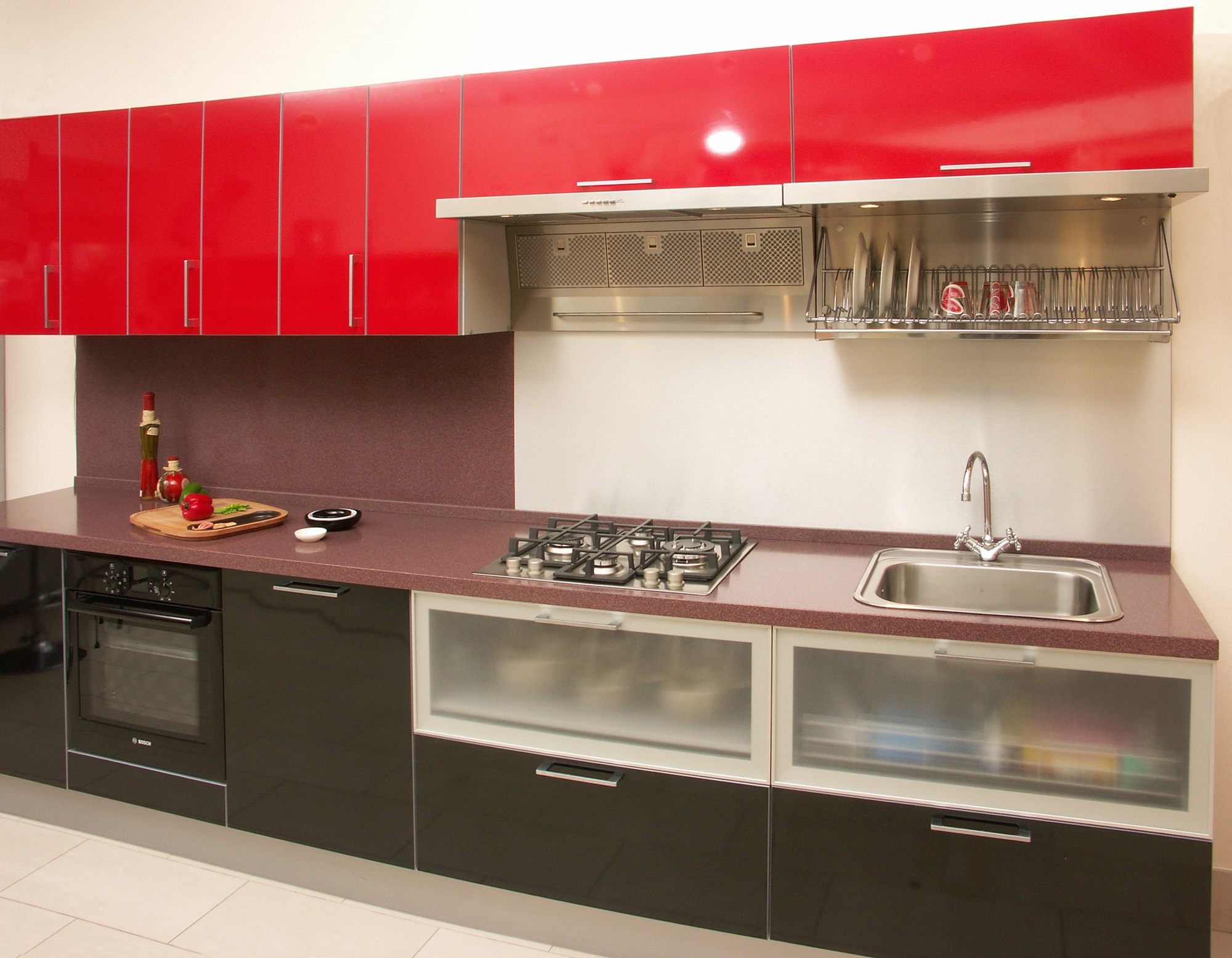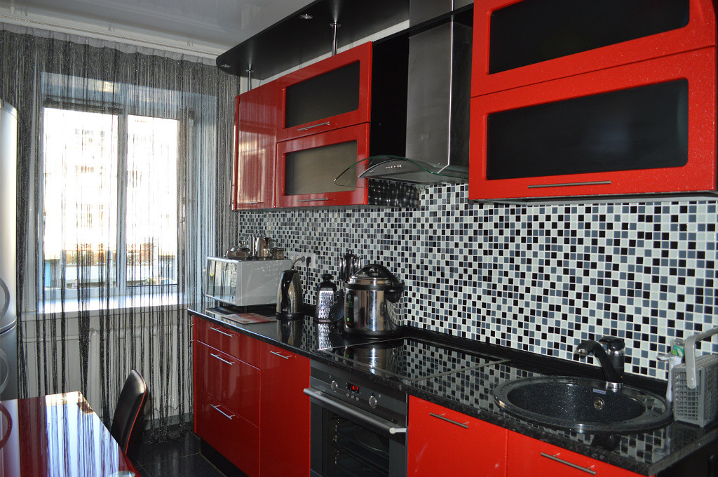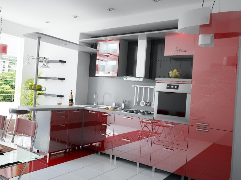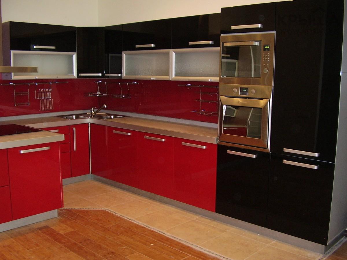 I mobili della cucina sono realizzati con vernice, smalto, vernici ad effetto metallico. I singoli elementi possono essere realizzati in vetro o metallo. Spesso usato da cucina rosso superiore nero inferiore, meno spesso - il posizionamento dei fiori sul principio di una scacchiera. Il nero può essere solo un dettaglio individuale che pacifica il tripudio del rosso, ad esempio i controsoffitti.