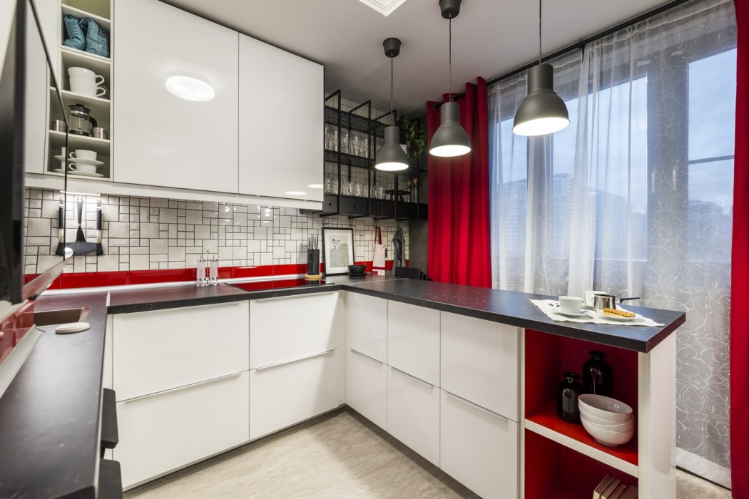 Il design espressivo a luce nera e rossa è più adatto a persone giovani ed energiche. Spesso questa cucina è scelta da giovani single o coppie che non hanno figli. Per accoglienti incontri serali davanti al tè con torte, le tonalità pastello sono più adatte.