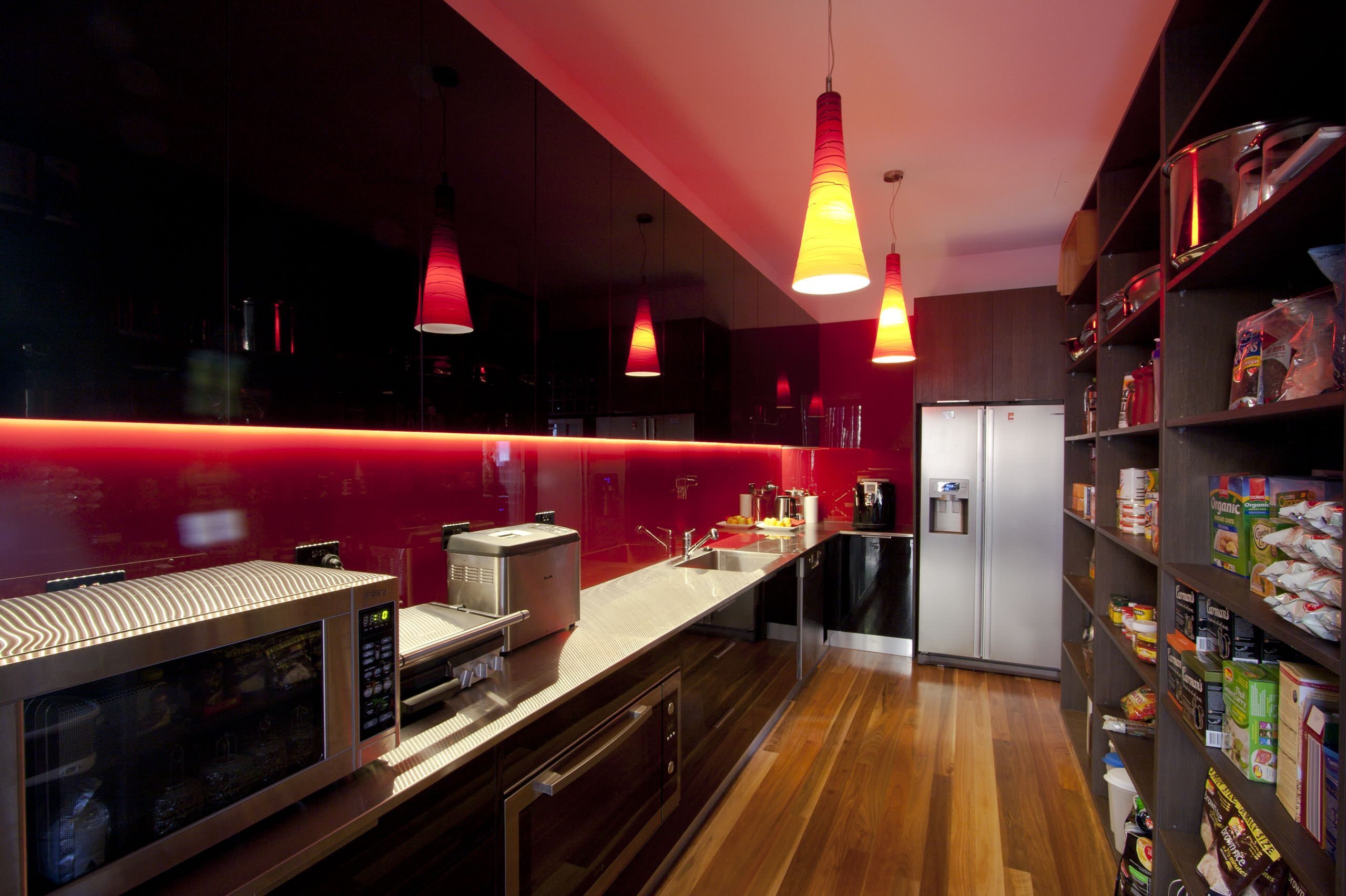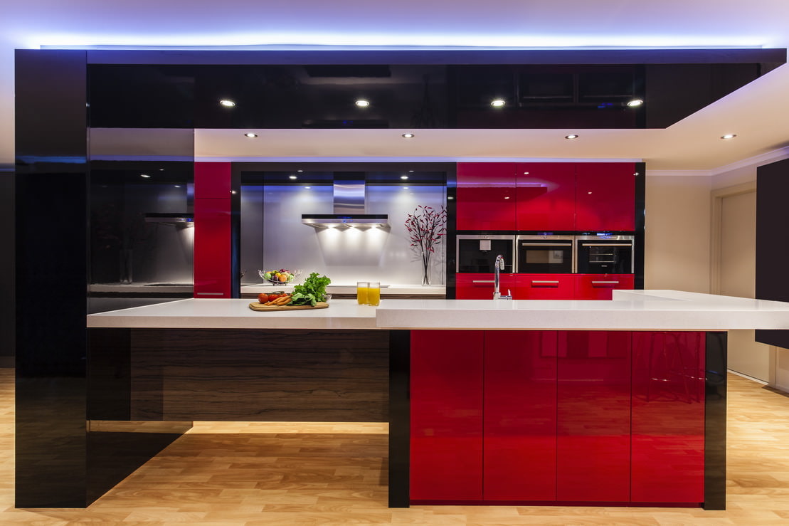 Data la quantità di attenzione che viene attratta da un set di mobili nero e rosso o da altri grandi elementi decorativi (ad esempio un grembiule o tende), l'illuminazione deve essere resa morbida e ordinata. È necessario utilizzare la suddivisione in zone per attenuare l'abbagliamento sui mobili e dare maggiore comfort alla cucina.