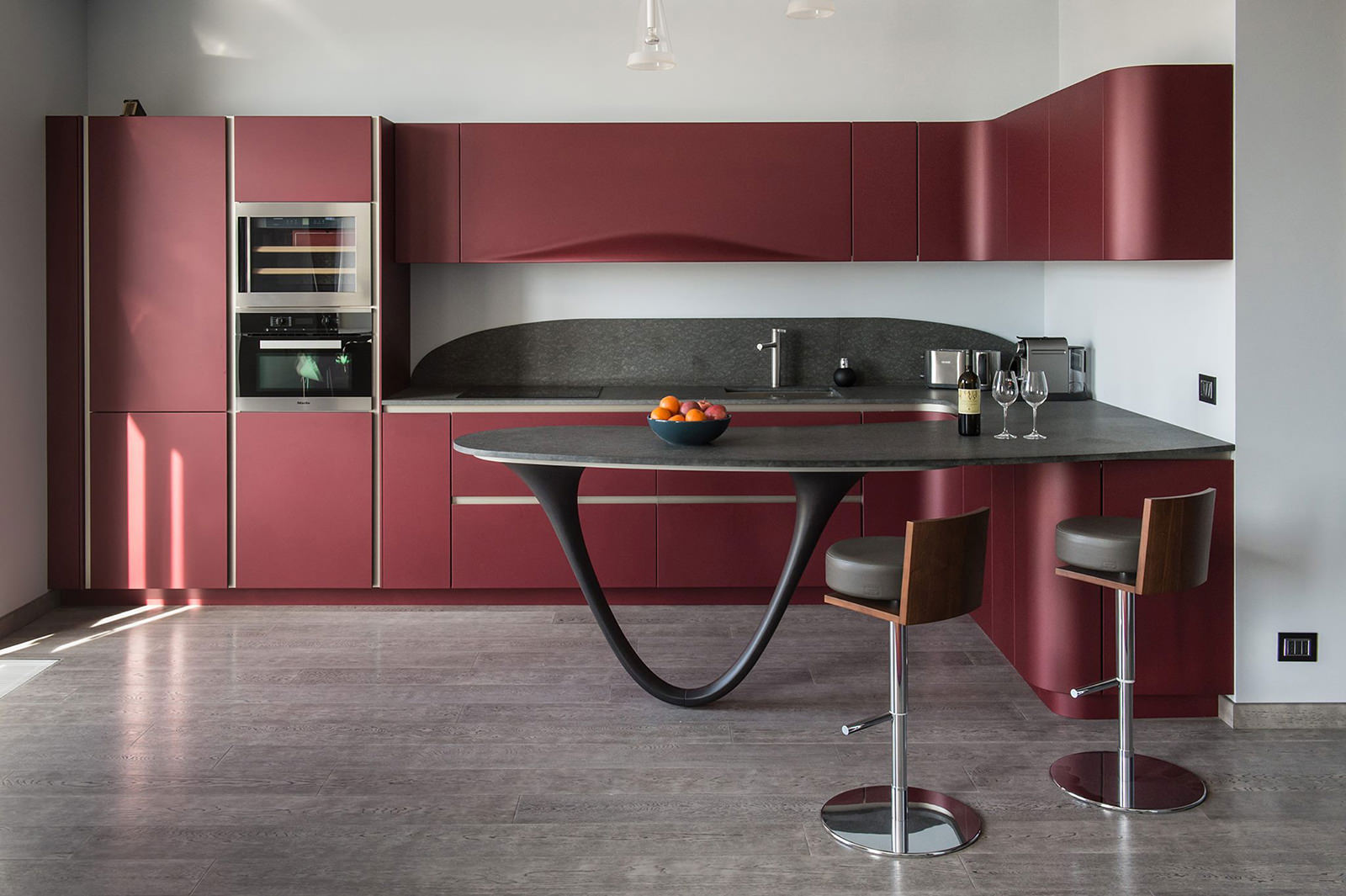 Il rosso porta espressione, mentre il nero enfatizza la purezza delle linee. Insieme, questi due colori creano un interno espressivo.
