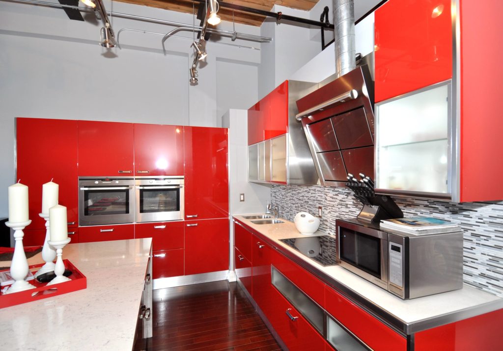 I principali accenti di colore in cucina sono i mobili.L'arredamento in rosso e nero ha un bell'aspetto sullo sfondo di pareti meno aggressive ed è quindi molto popolare per l'arredamento di loft o monolocali. Allo stesso tempo giocano con una combinazione di facciate e controsoffitti, usando non solo i colori, ma anche trame diverse.