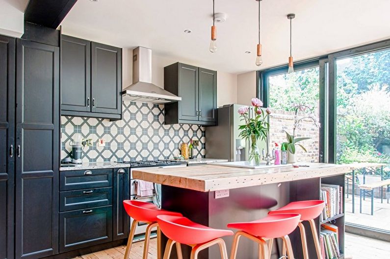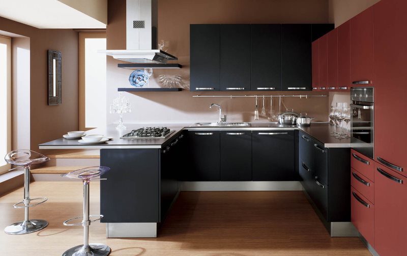 - Mobili e una combinazione di tonalità in una cucina rosso-nera