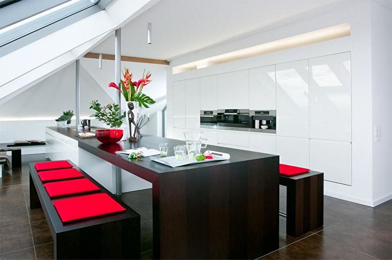 Allo stesso tempo, l'interno nero e rosso indica la presenza di un sottile senso del gusto nel proprietario. Spesso queste cucine sono realizzate in stile giapponese. È minimalista, sobrio, ma allo stesso tempo spiritualizzato e molto a suo agio. Questo è sia rigore aristocratico che raffinatezza orientale in una bottiglia. Ottimo per persone creative e creative.