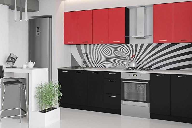 Per scegliere il design per le pareti, dovresti guardare la foto della cucina rosso-nera realizzata da designer professionisti. Il grembiule sul piano cottura e sul lavandino è spesso realizzato non solo nella piastrella, ma anche ricoperto di vetro con carta da parati fotografica. Questo esempio ti consente di applicare qualsiasi motivo sul muro tra i pensili e il piano di lavoro, dai papaveri rossi a Wall Street o le coccinelle.