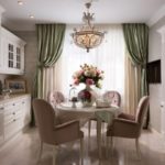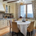 Il design classico della cucina è una combinazione di colori chiari e scuri. Le sedie, di colore scuro, stanno bene accanto al tavolo in legno chiaro e all'arredamento della cucina, fatto in bianco e nero.