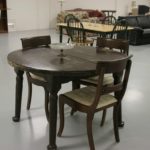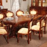 Sedia con seduta e schienale imbottiti, con rivestimento jacquard. Questo è uno dei tessuti più costosi e belli, quindi il modello ha un prezzo più alto rispetto ai precedenti. È decorato in colori scuri, il tessuto ha un bellissimo motivo originale in stile classico.