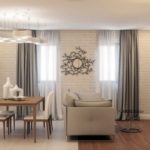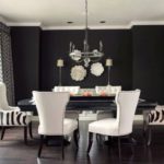 La sala hi-tech è idealmente combinata con sedie in metallo con rivestimento semplice. La combinazione di tessuto bianco e nero si adatta a un interno discreto.