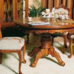 Modelli di sedie in legno con seduta morbida imbottita in gregge. Soprattutto, si avvicineranno all'appartamento, dominato da colori pastello e tenui. Questi esempi mostrano chiaramente che un albero chiaro è meglio combinato con un tessuto di colori giallo, bianco o pastello e uno scuro appare migliore con il blu o, per esempio, con il bordeaux.