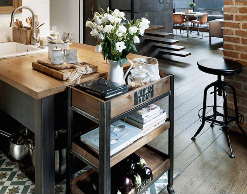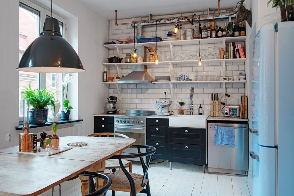 Il rack come elemento della disposizione della cucina diventa una soluzione originale nella preparazione di un interno funzionale.