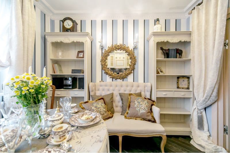 Le sezioni strette vengono utilizzate attivamente come partizioni o elementi di suddivisione in zone.Ad esempio, un tale elemento si adatterà organicamente all'interno, dove la cucina è divisa in una sala da pranzo e un'area di lavoro.