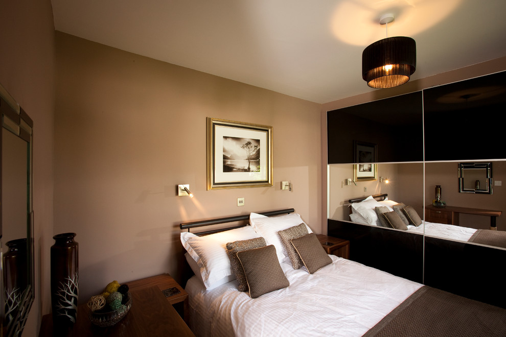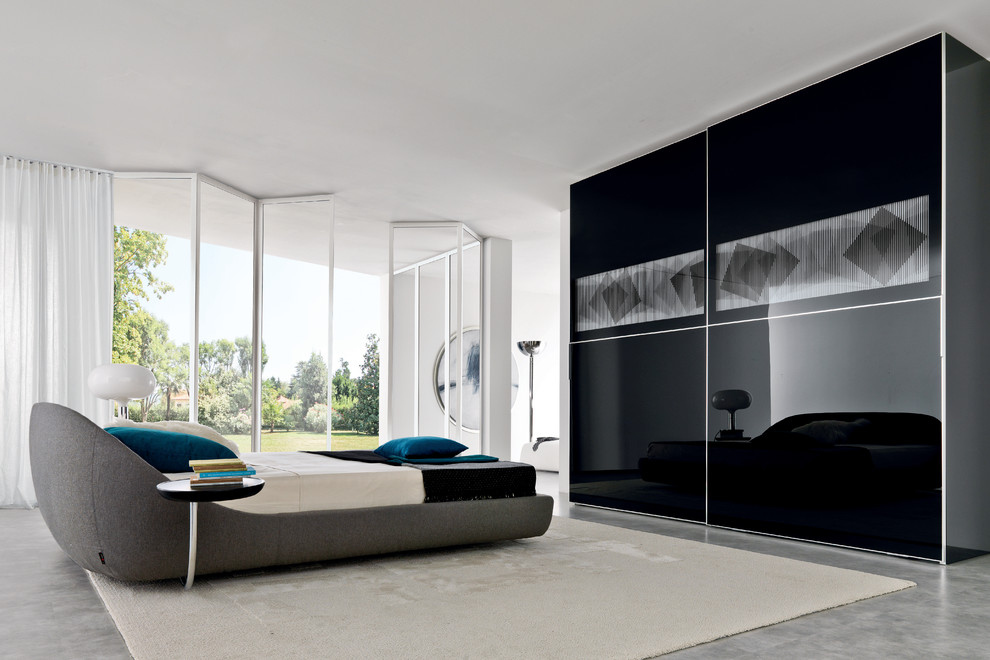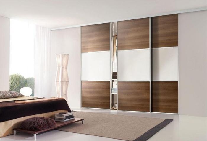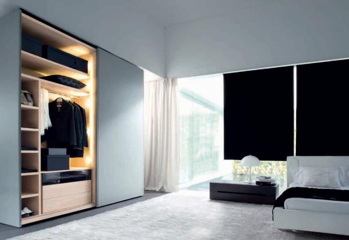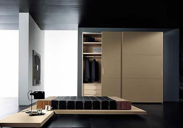 sistema di porte scorrevoli - È necessario tenere conto delle dimensioni ridotte della camera da letto e del suo riempimento con mobili. Di conseguenza, selezionare le dimensioni e la forma del cabinet per questi parametri.