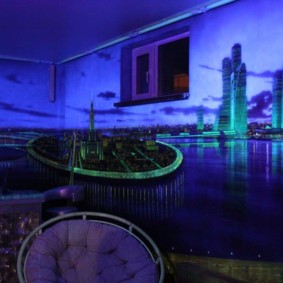 Les revêtements fluorescents qui brillent dans l'obscurité sont l'une des options les plus intéressantes pour les peintures murales photo 3D. L'après-midi, de tels revêtements ont généralement l'air, mais avec le début de l'obscurité, un beau motif lumineux apparaît sur un fond noir, ce qui créera une atmosphère incroyable dans la pièce.
