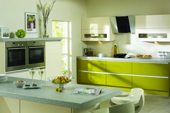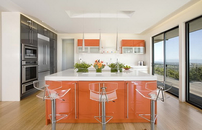 La texture transparente du verre rend l'intérieur plus lumineux et aéré. Cependant, le verre est très fragile, les produits ne sont pas durables. Le plan de travail est froid au toucher et difficile à entretenir. Gamme de prix - moyenne à élevée.