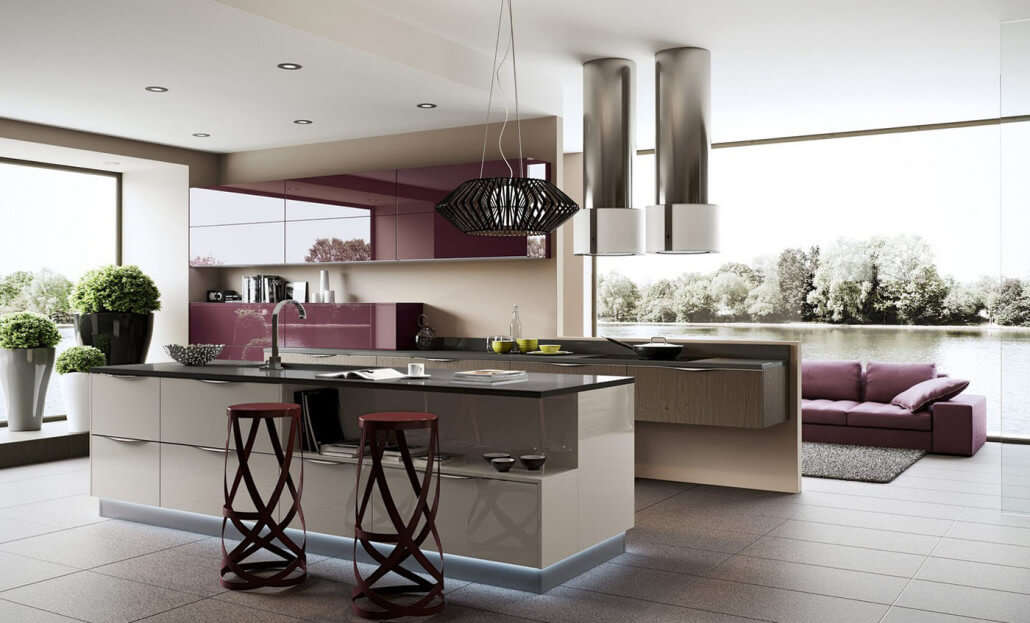 Le rack bouclé, debout séparément sous la forme de la console ou d'un îlot ressemble à l'origine. Ce qui, avec sa forme flexible et ses courbes lisses, illumine la franchise et la géométrie des lignes d'une cuisine horizontale.