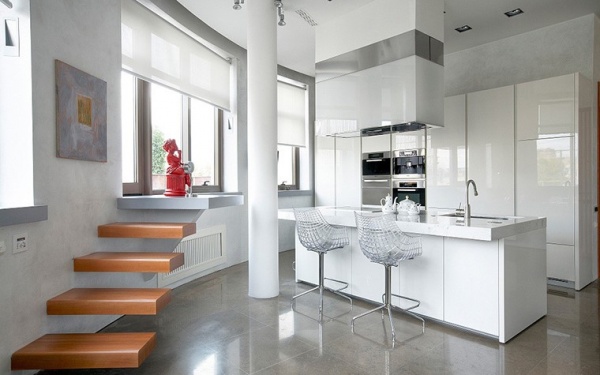 La barre de rack peut devenir une tache centrale conditionnellement lumineuse dans un casque blanc. Le minimalisme se caractérise par une abondance de métal et de plastique. Tous les meubles et comptoirs de bar sont faits de matériaux pratiques.