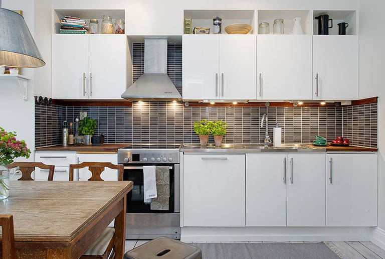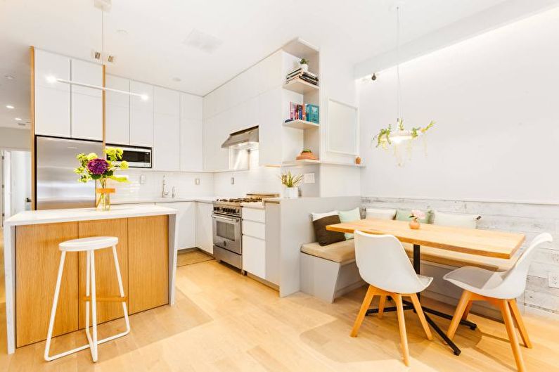 Le premier à devenir des résidents si installés de la Scandinavie, le design éponyme était répandu. C'est un mélange d'ethnie et de pays du nord, de classiques et de minimalisme moderne. Il était incarné en bois naturel et une surface blanche de meubles, comme cette cuisine blanche à l'intérieur de la photo.